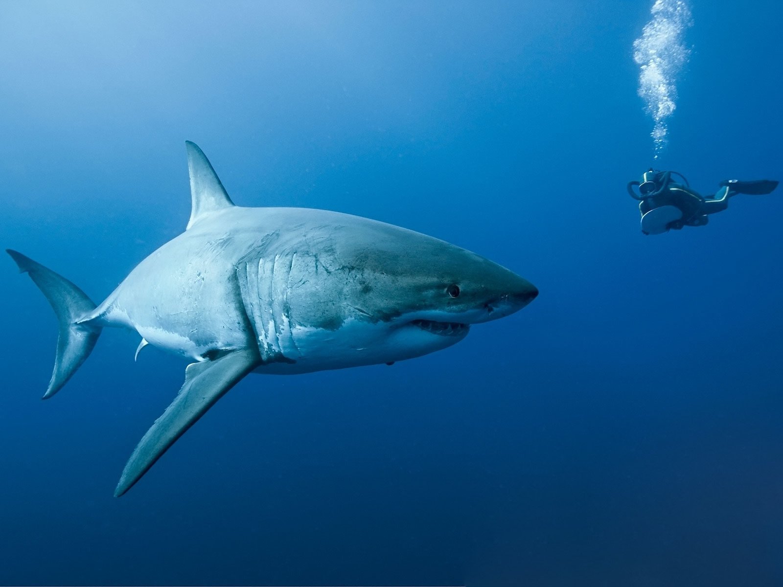 Uno squalo sott'acqua nell'oceano guarda un subacqueo