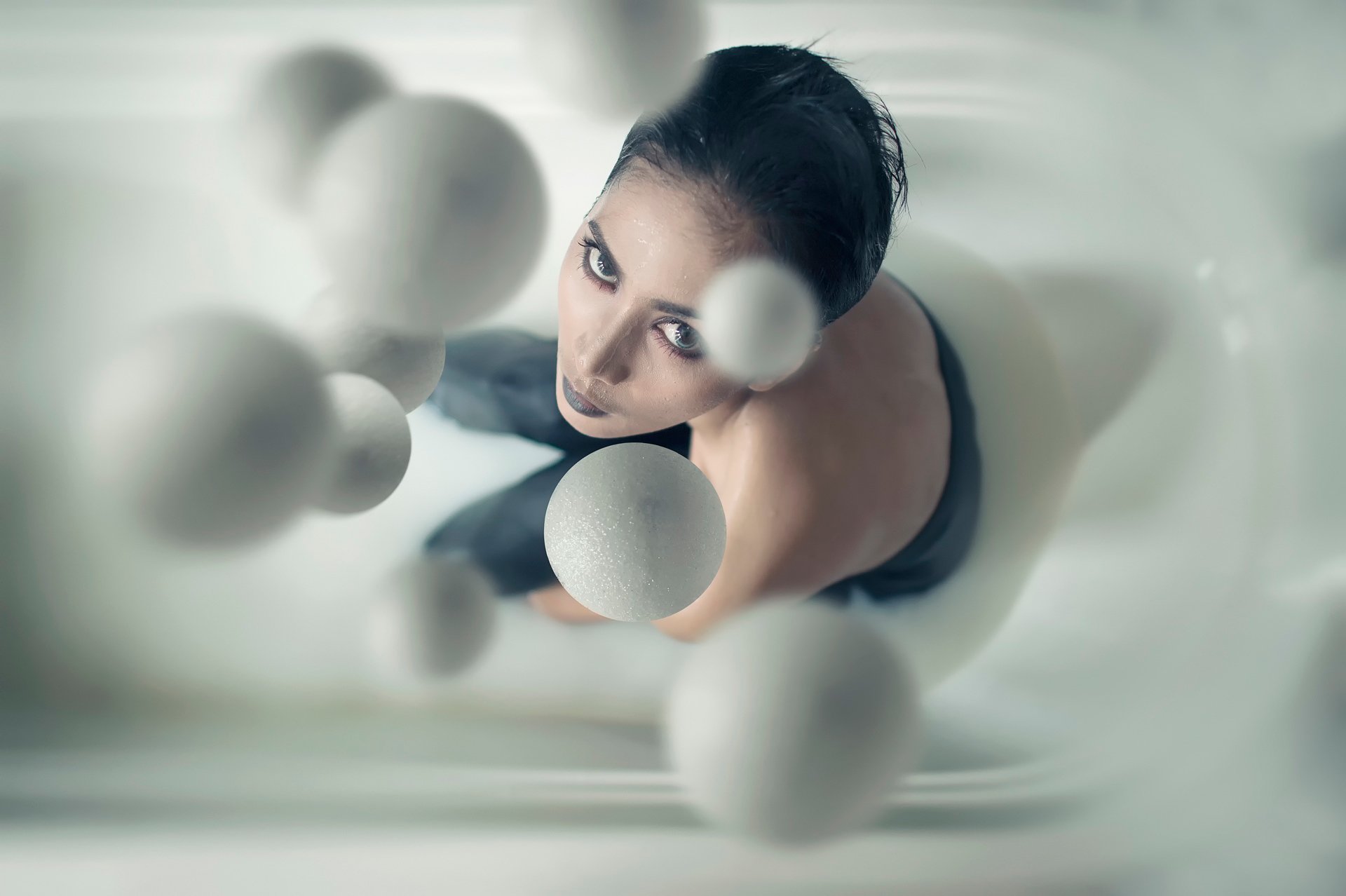 Ragazza con trucco luminoso guarda le palle lattiginose