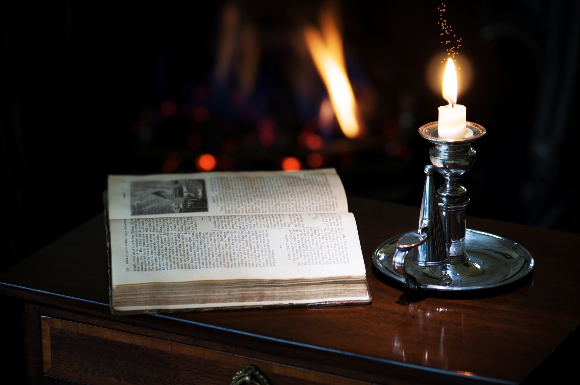 Sul comodino c è una candela in un candelabro e un libro aperto
