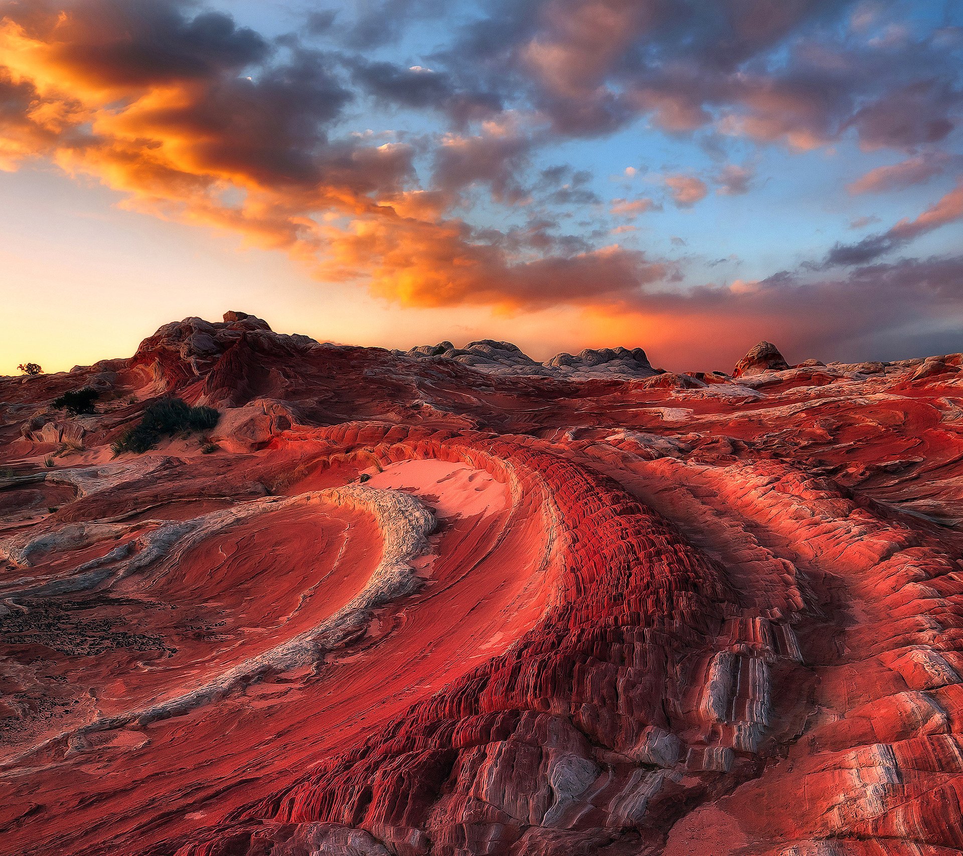 Montagne ondulate rosse su uno sfondo di un cielo rosso-blu