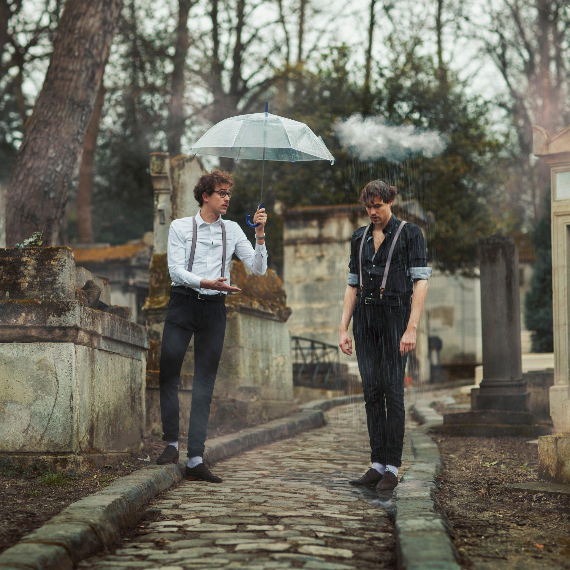 Due uomini sotto la pioggia, uno di loro sotto l'ombrello