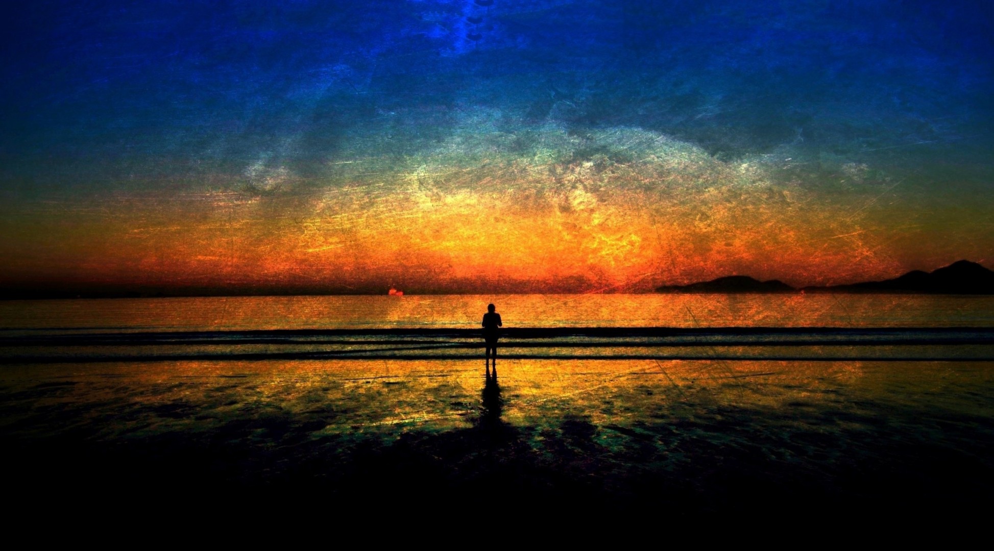 Disegno di un uomo solitario in riva al mare. tramontoDisegno di un uomo solitario in riva al mare. Tramonto