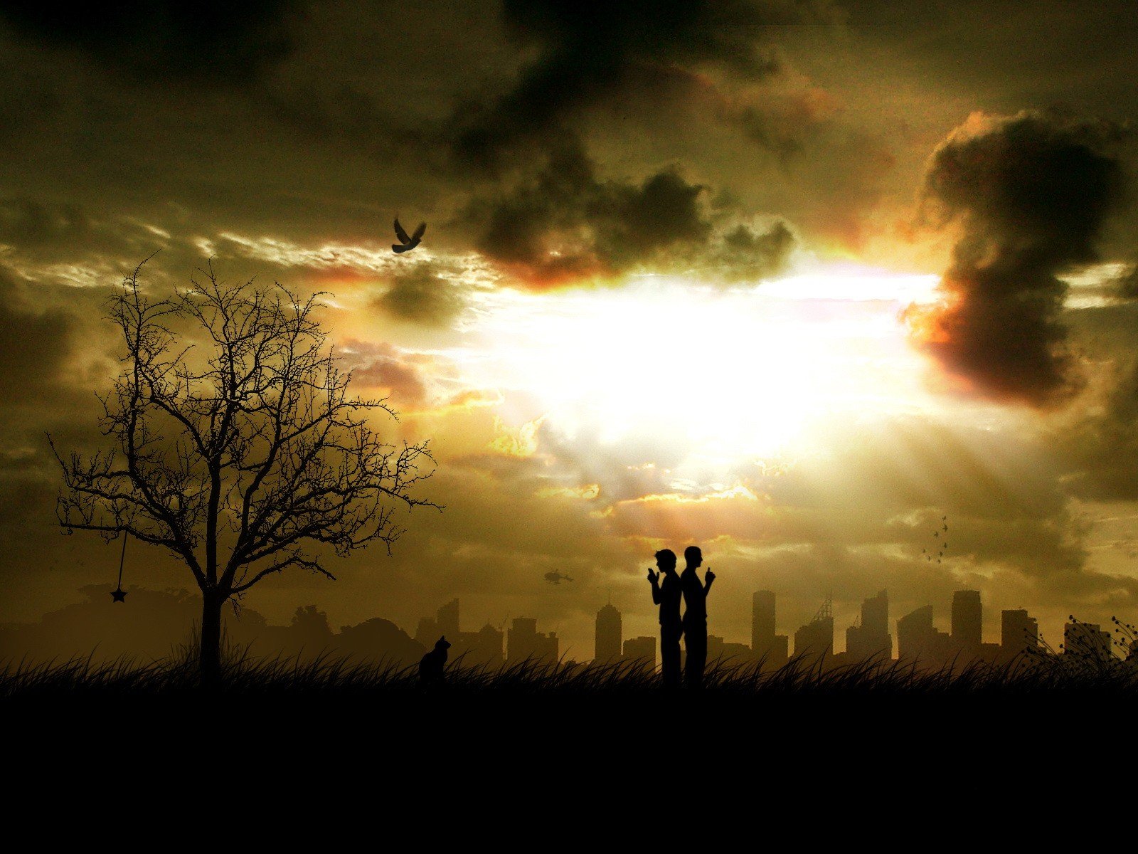 Due persone vicino a un albero stanno schiena contro schiena l'una verso l'altra