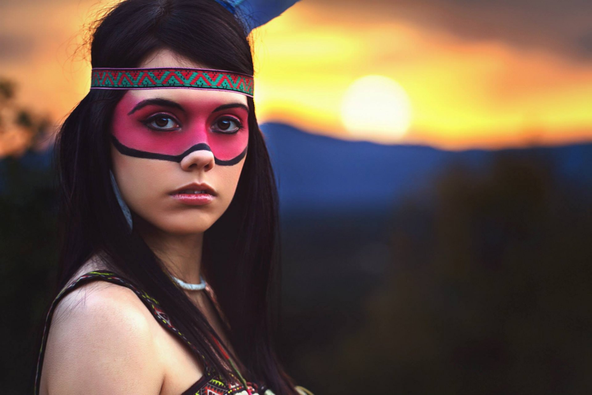 Ragazza con il viso dipinto sullo sfondo del tramontoRagazza con il viso dipinto sullo sfondo del tramonto