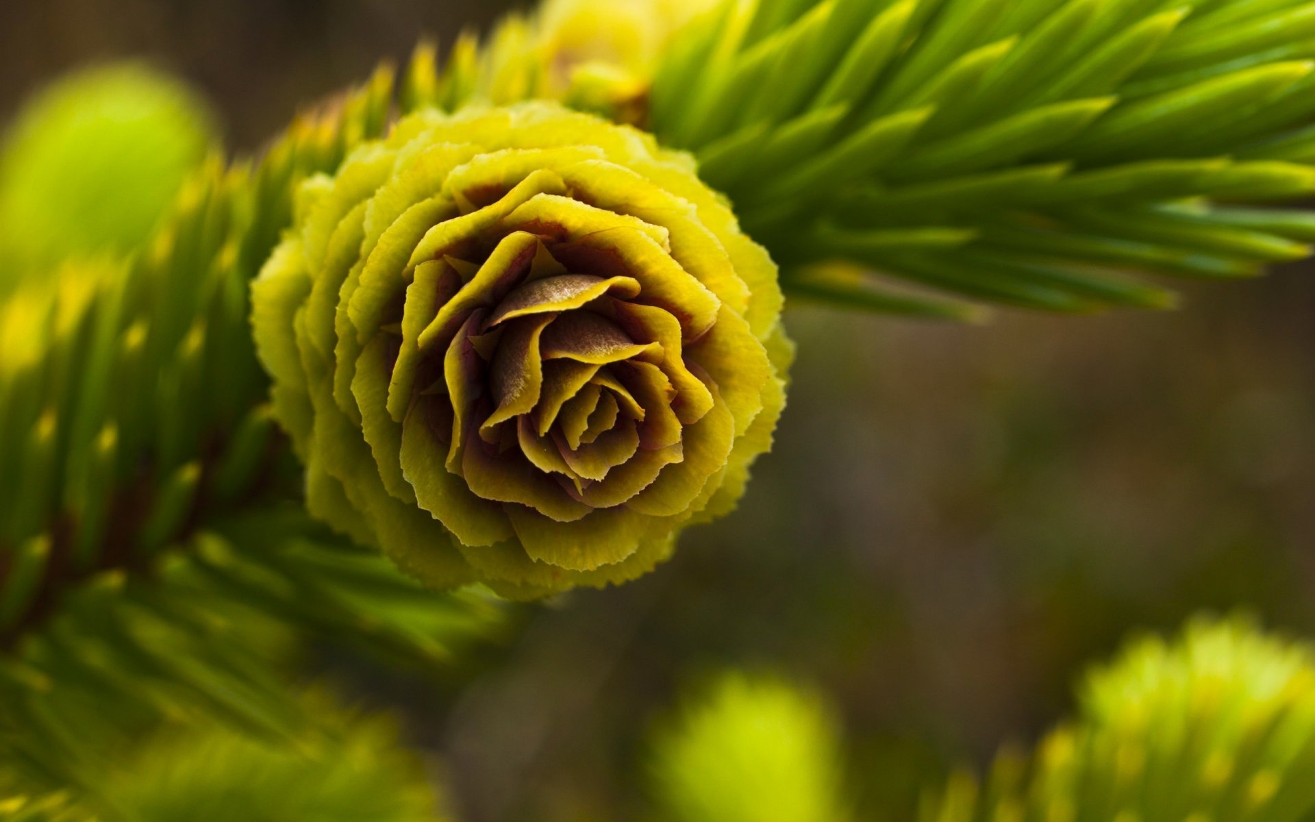 Un'enorme montagna può essere vista attraverso l'effetto macro degli aghi di abete rossoUn'enorme montagna può essere vista attraverso l'effetto macro degli aghi di abete rosso