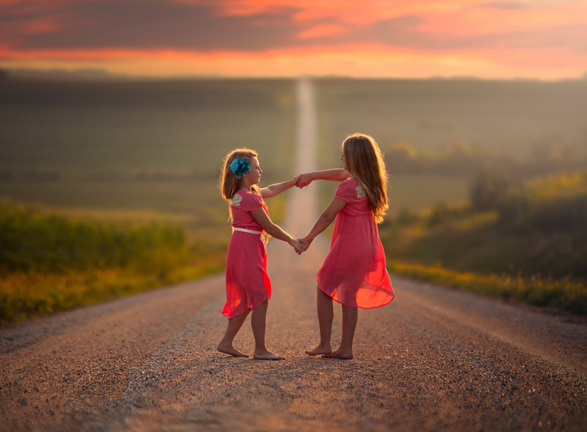 Ragazza che balla sulla strada sotto la pioggia. tramonto arancioneRagazza che balla sulla strada sotto la pioggia. Tramonto arancione
