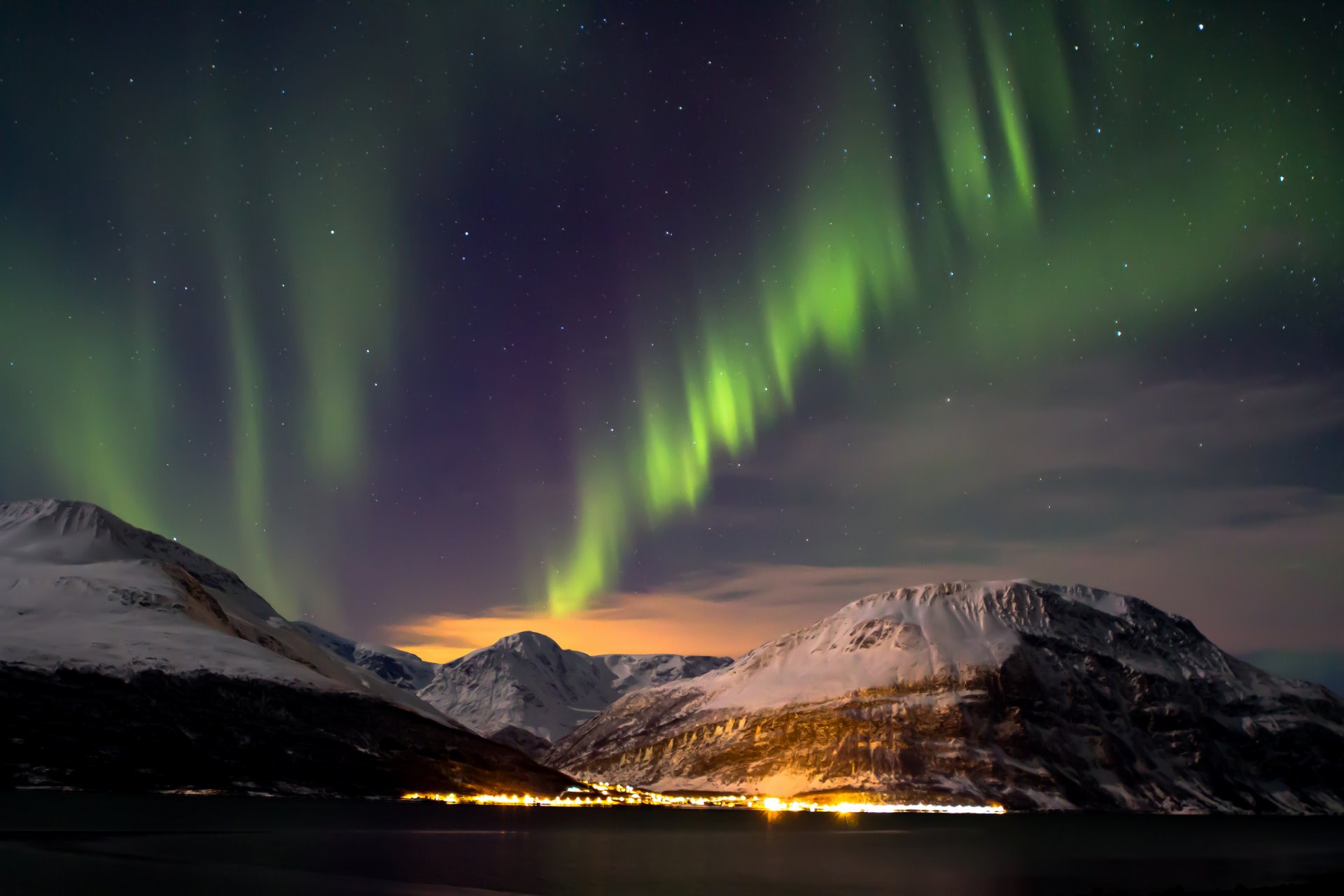Aurora boreale in montagna. Meraviglia verde nel cielo