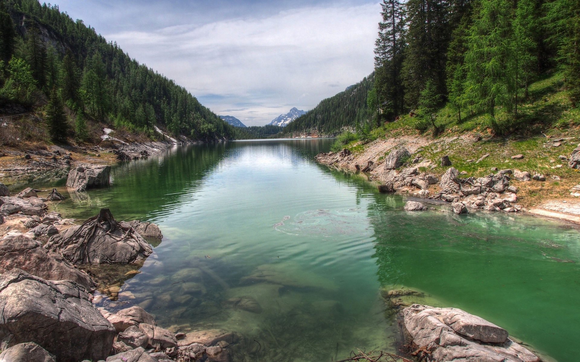 Fiume di montagna trasparente con incredibile natura boschi pendii e grandi pietreFiume di montagna trasparente con incredibile natura boschi pendii e grandi pietre
