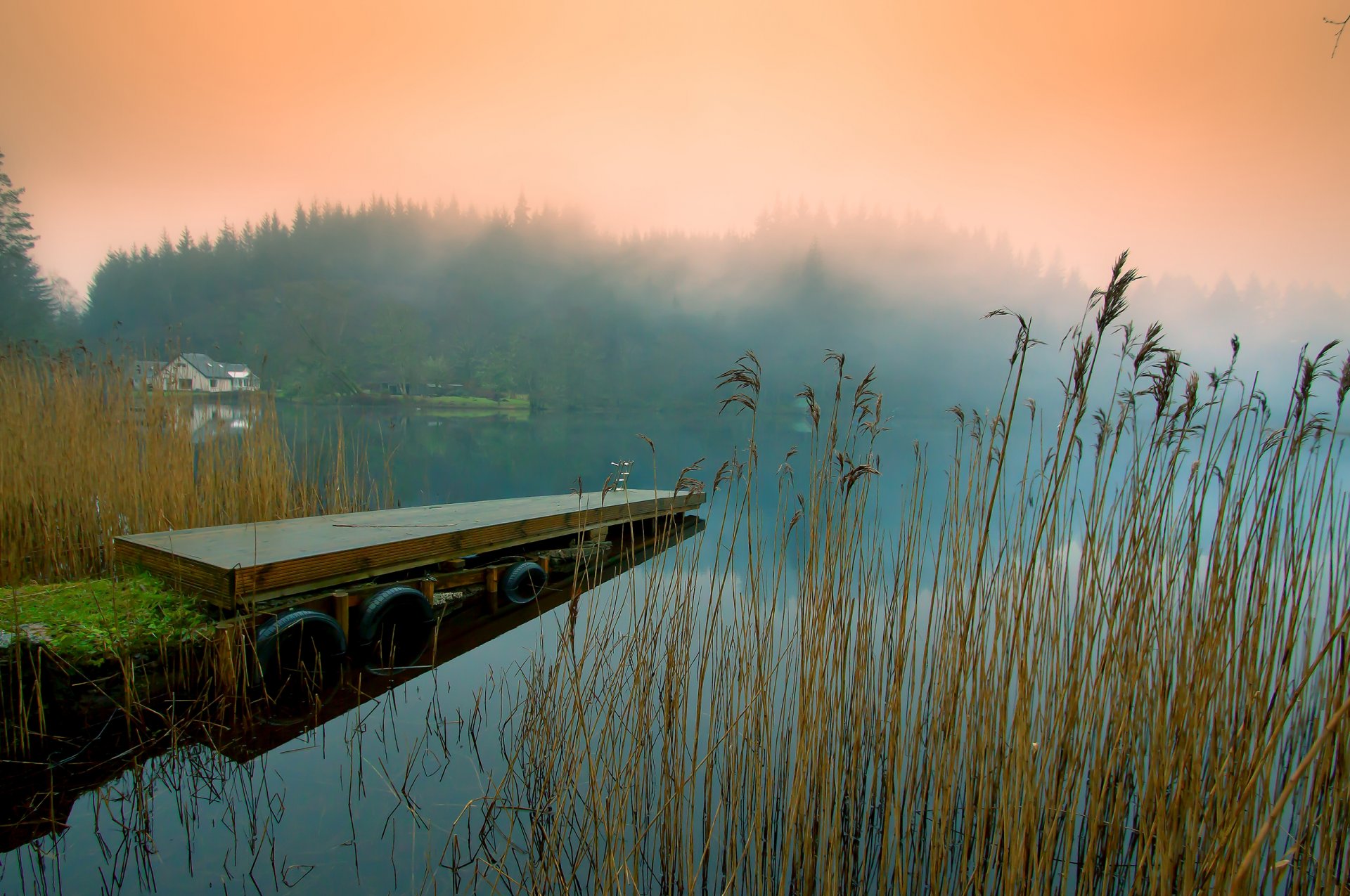 Nebbia mattutina sul lago con canne