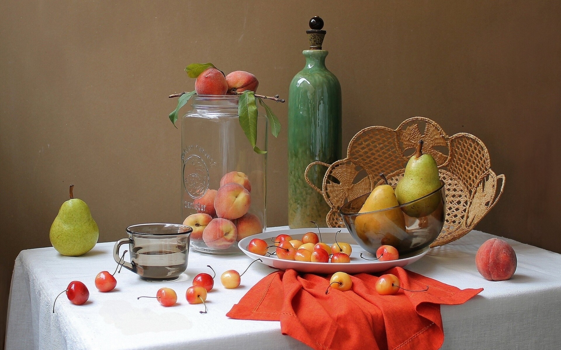 Natura morta bacche luminose e tovagliolo, pesche in una brocca trasparente, pere in una tazzaNatura morta bacche luminose e tovagliolo, pesche in una brocca trasparente, pere in una tazza