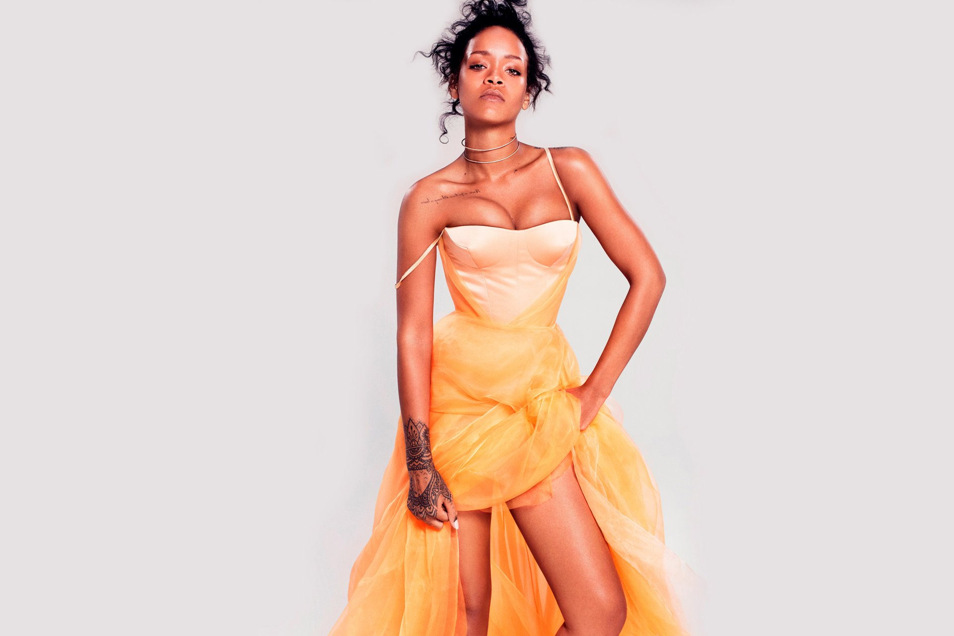 Rihanna. Cantante. Sorriso. Ragazza su sfondo arancione