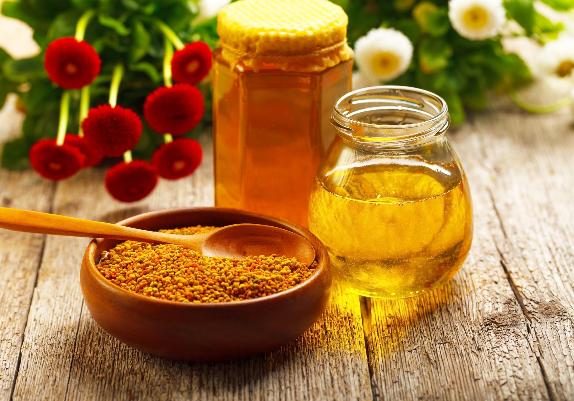Miele in barattoli trasparenti su uno sfondo di fioriMiele in barattoli trasparenti su uno sfondo di fiori