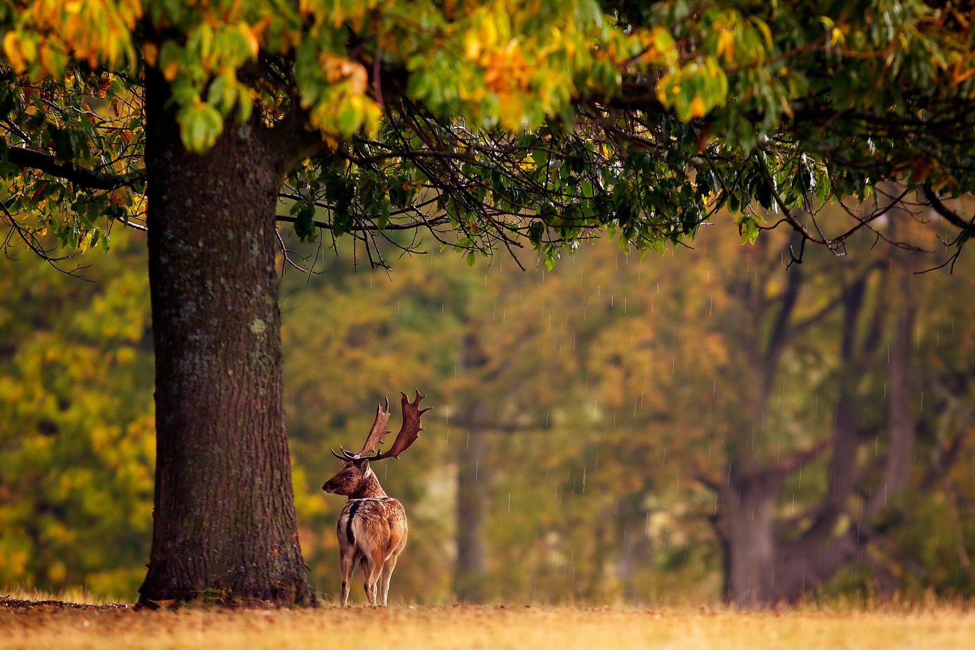 Cervo in una giornata autunnale piovosa nella forestaCervo in una giornata autunnale piovosa nella foresta