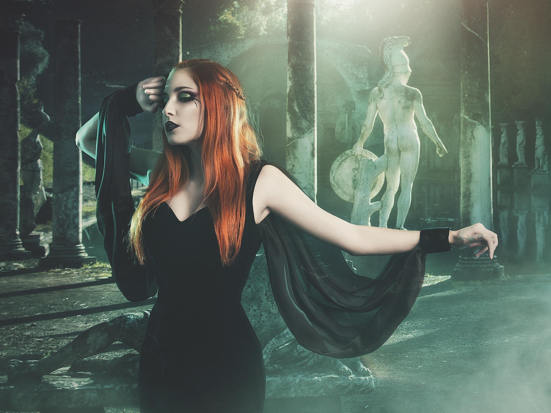 Ragazza in nero su sfondo statua