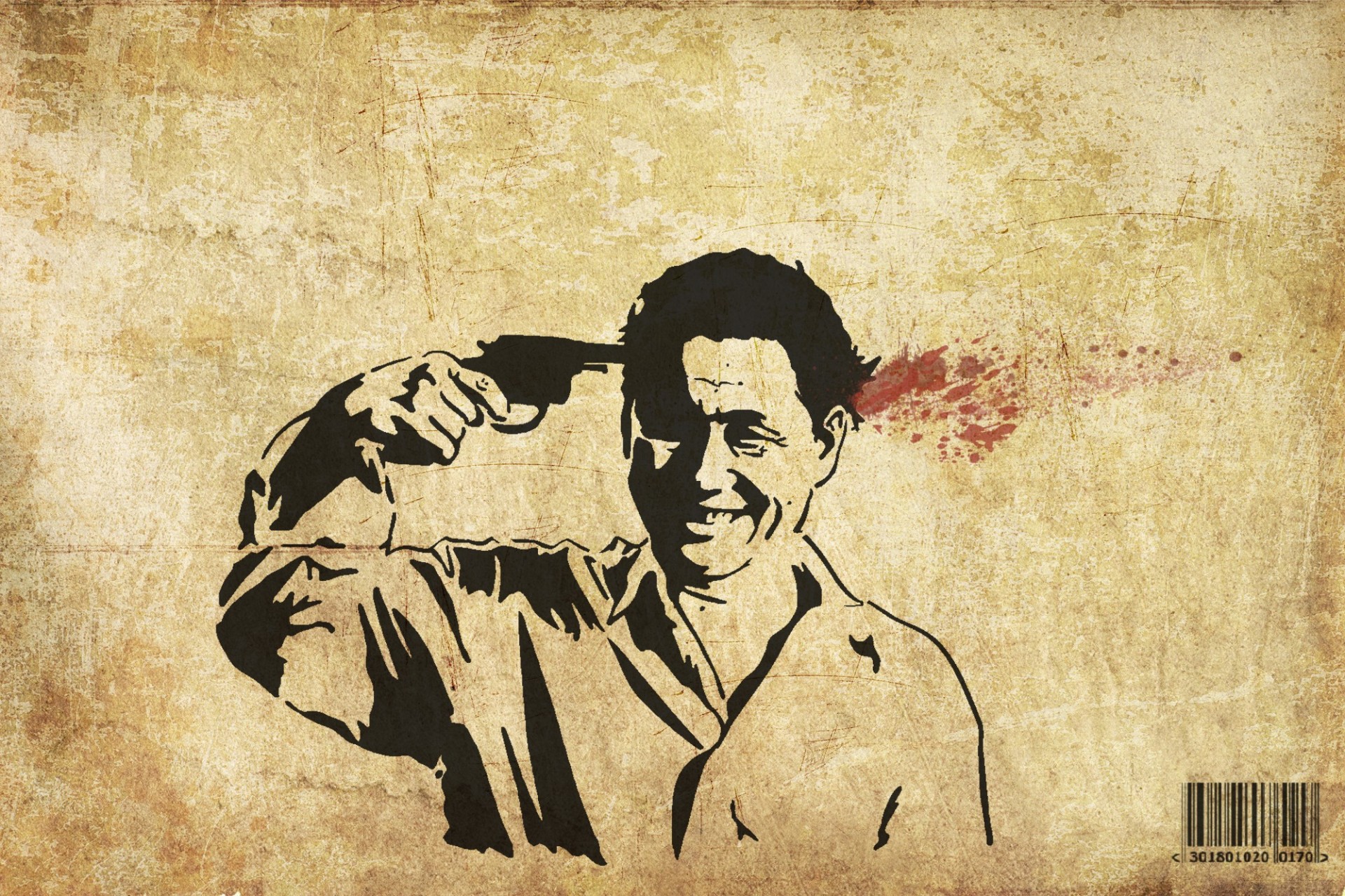 Disegno con un uomo sorridente che commette suicidio con una pistola e un codice a barreDisegno con un uomo sorridente che commette suicidio con una pistola e un codice a barre