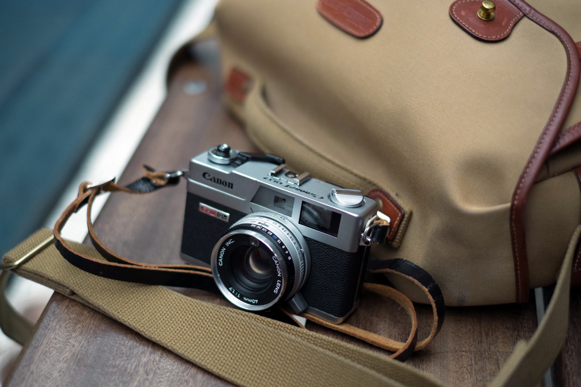 La fotocamera reflex per le riprese si trova sulla borsa beigeLa fotocamera reflex per le riprese si trova sulla borsa beige