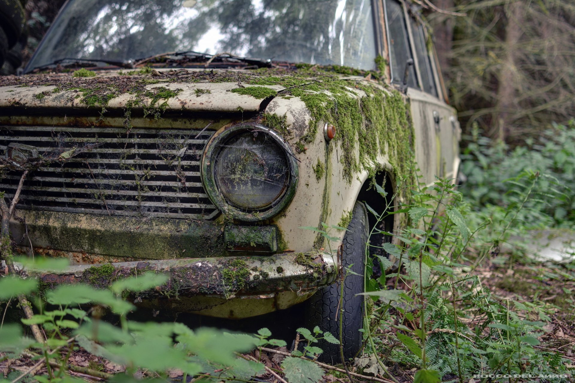 Vecchia macchina coperta di muschio si trova nella forestaVecchia macchina coperta di muschio si trova nella foresta