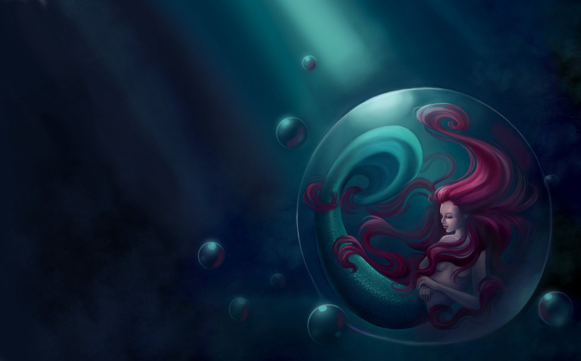 Sirena con capelli rossi nella bolla sul fondo del mareSirena con Capelli rossi nella bolla sul fondo del mare