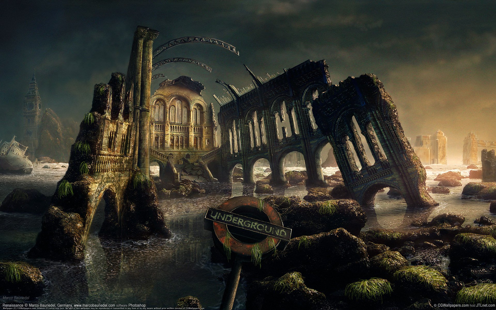 Attore di terminator in piedi in un edificio distruttoAttore di Terminator in piedi in un edificio distrutto