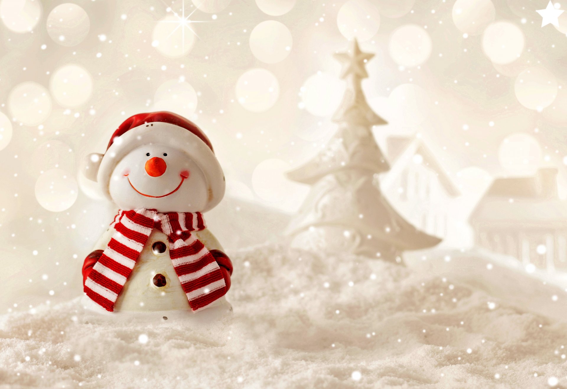 Pupazzo di neve in sciarpa a righe su sfondo invernalePupazzo di neve in sciarpa a righe su sfondo invernale