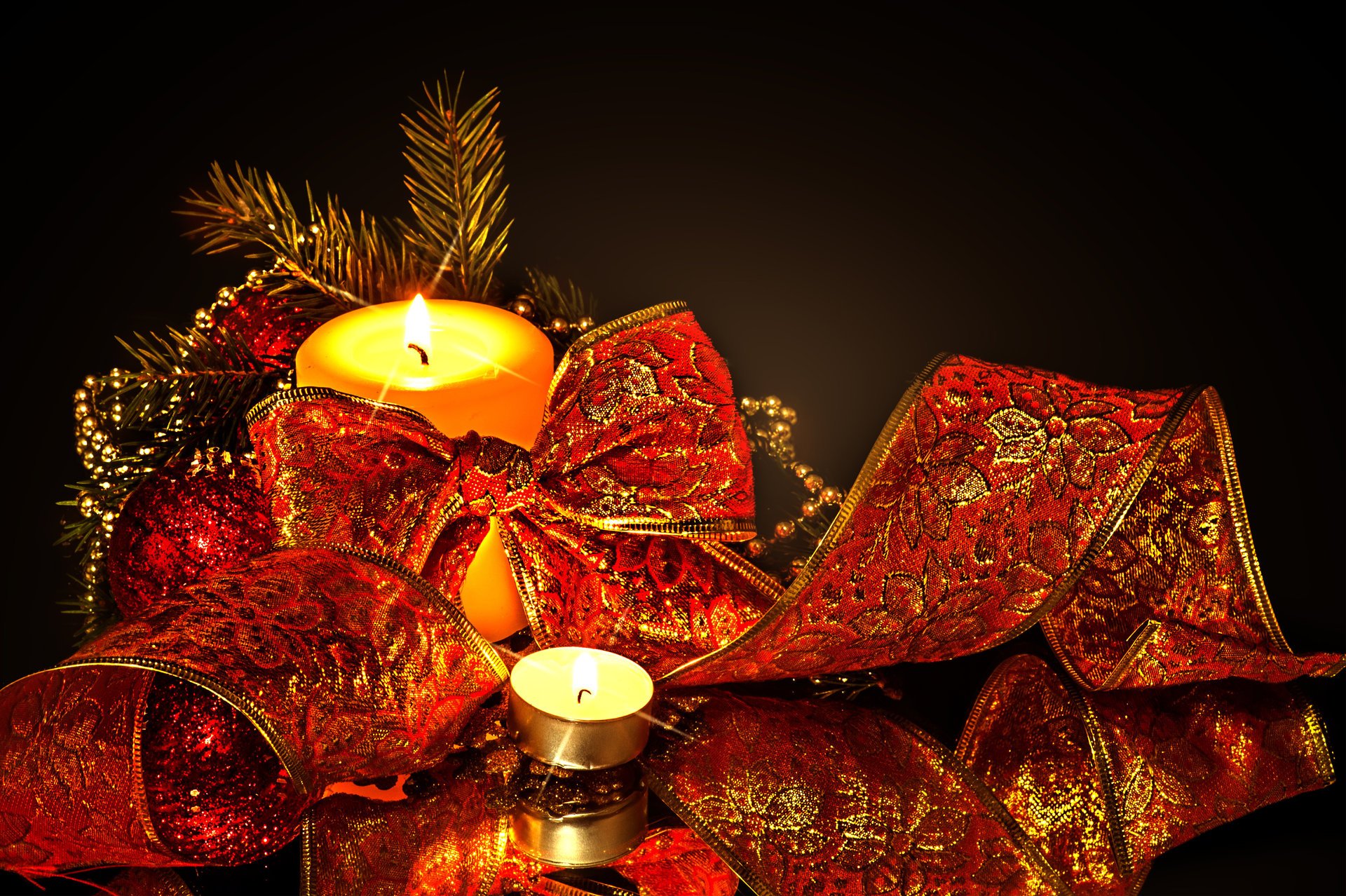 Decorazioni natalizie su uno sfondo di nastri e candeleDecorazioni natalizie su uno sfondo di nastri e candele