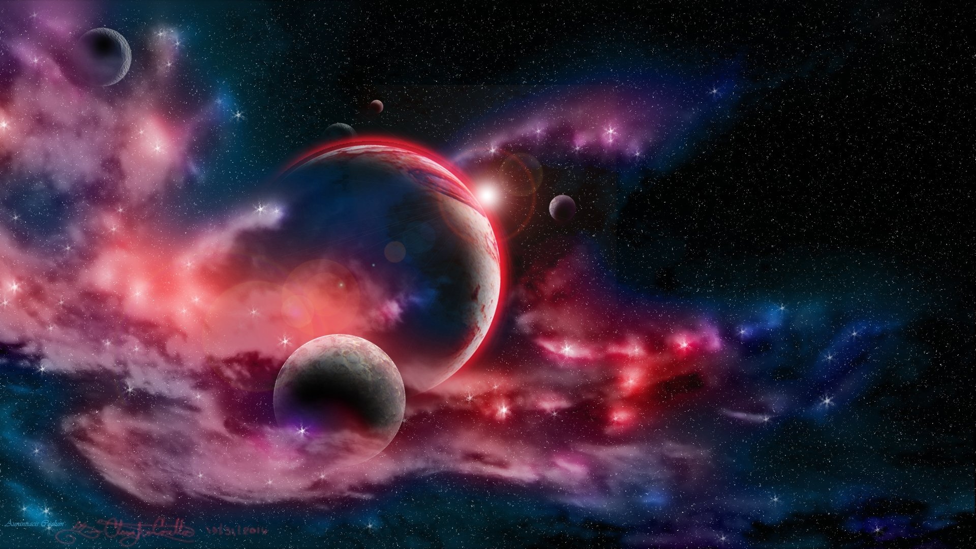 Rappresentazione fantasy dei pianeti e della nebulosa cosmicaRappresentazione Fantasy dei pianeti e della nebulosa cosmica