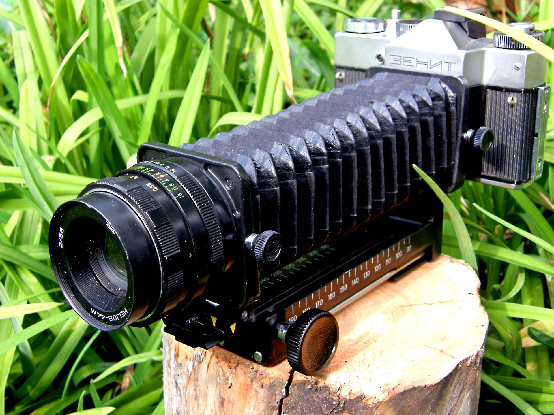 Obiettivo della fotocamera a fisarmonica zenith su un moncone su uno sfondo di erbaObiettivo della fotocamera a fisarmonica Zenith su un moncone su uno sfondo di erba