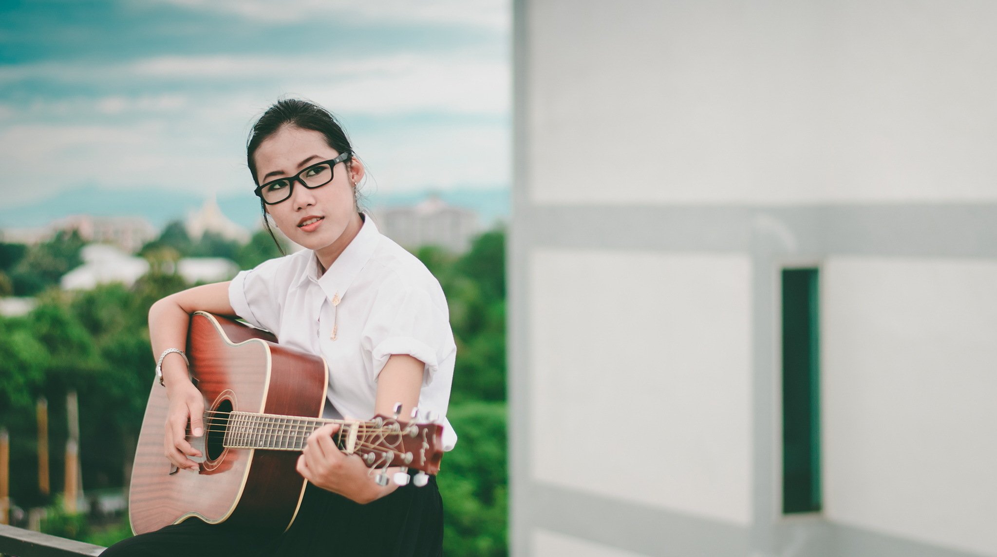 Bruna si siede su una panchina e suona la chitarraBruna si siede su una panchina e suona la chitarra