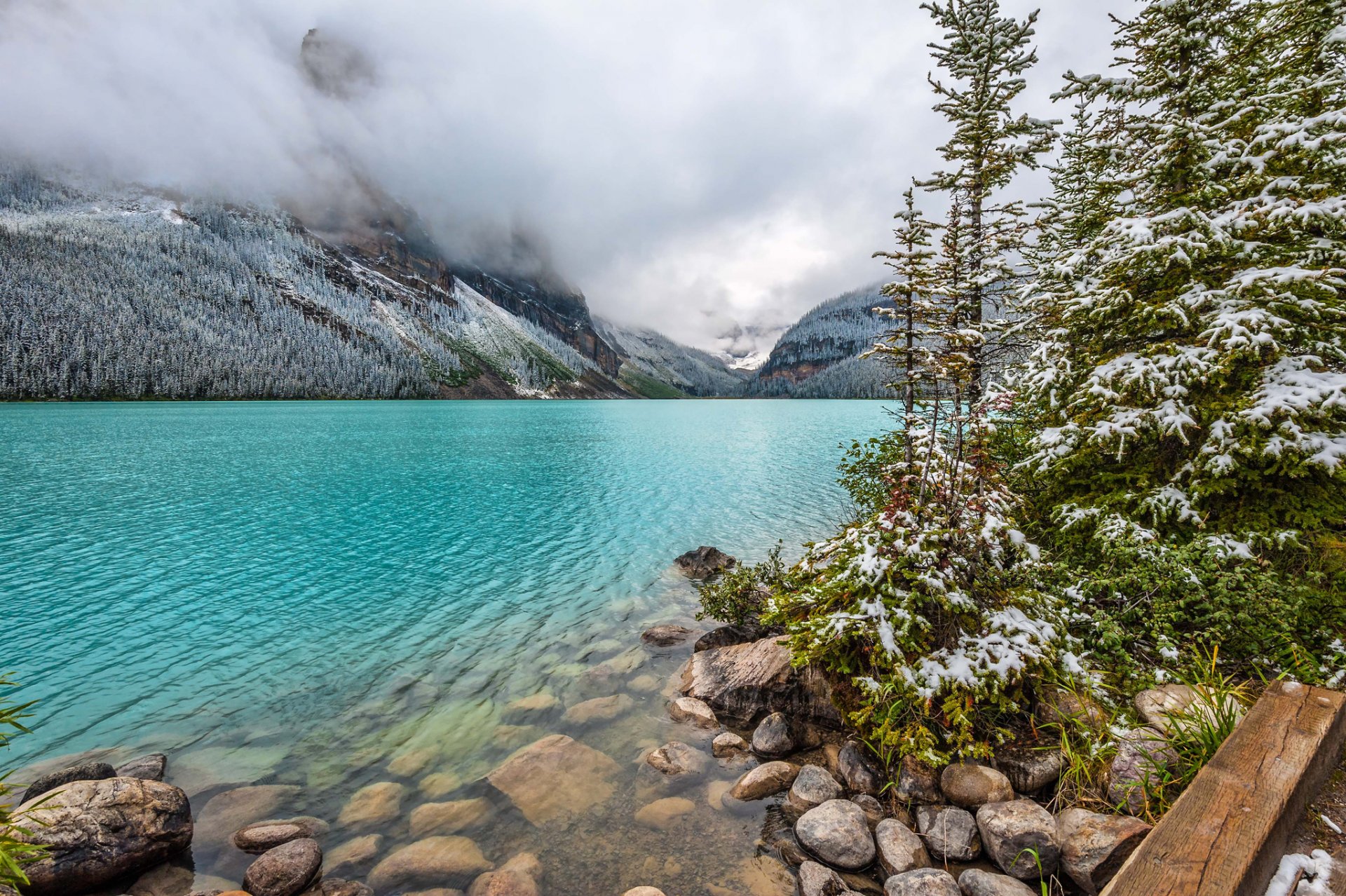 Nuvole sopra il lago blu nel Parco Nazionale di Jasper in Canada