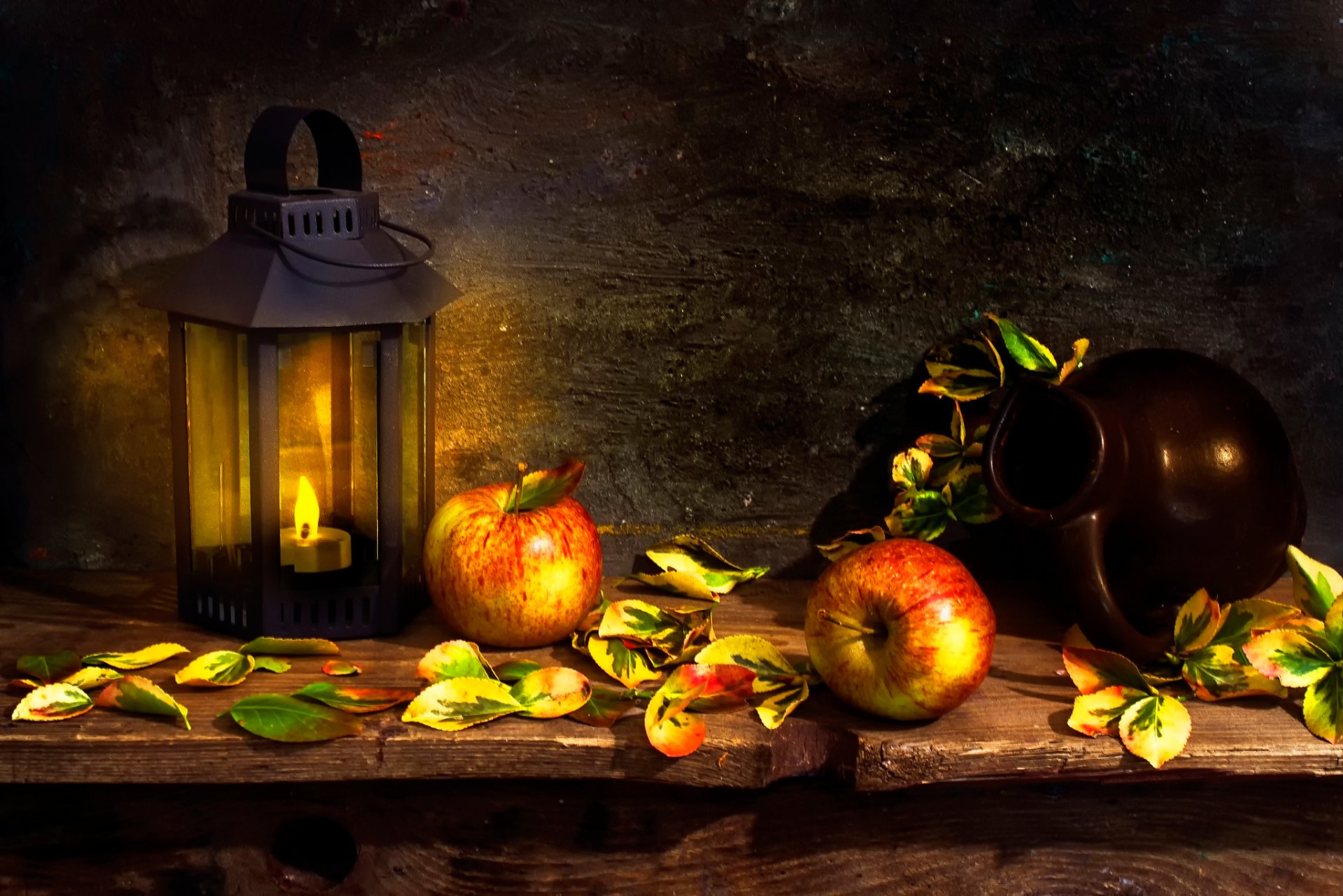 Mele riscaldate dal bagliore della lanterna vicino alla broccaMele riscaldate dal bagliore della lanterna vicino alla brocca