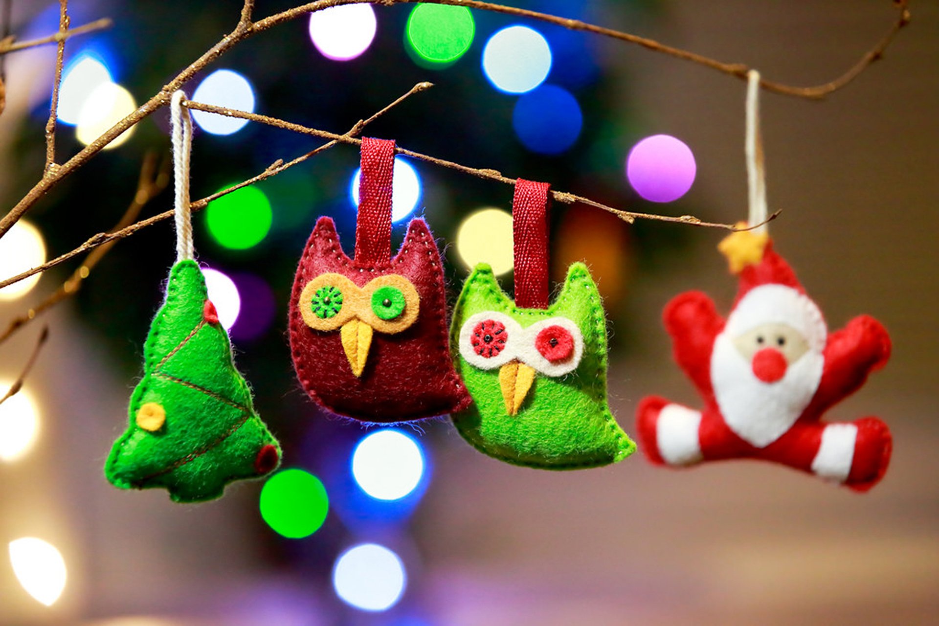 Gufi verdi e rossi con un albero di natale e babbo natale su un ramoGufi verdi e rossi con un albero di Natale e Babbo Natale su un ramo