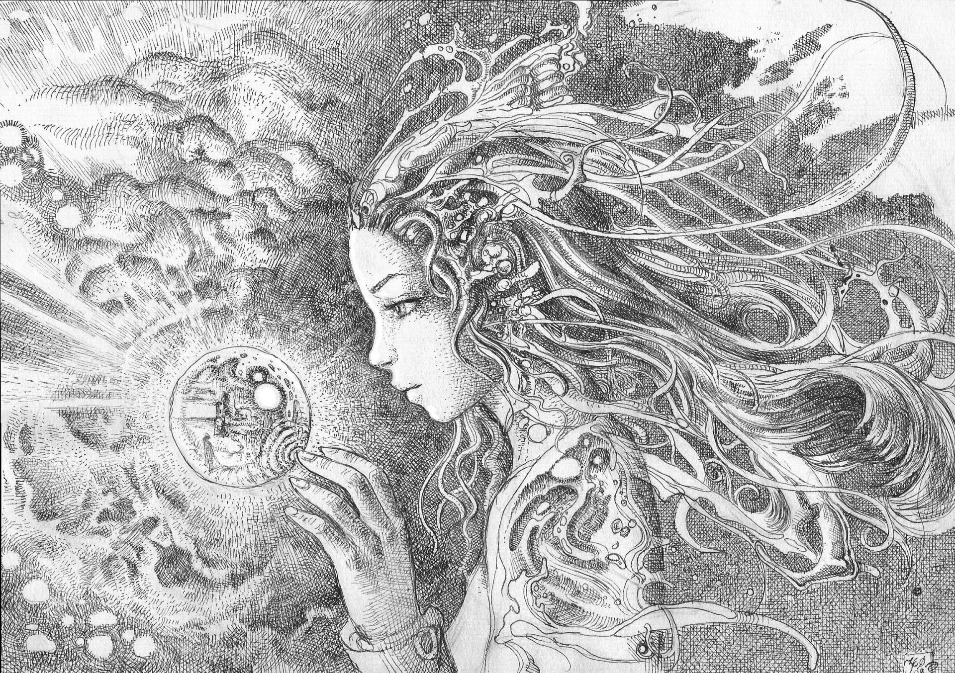 Disegno in bianco e nero di una ragazza con una pallaDisegno in bianco e nero di una ragazza con una palla