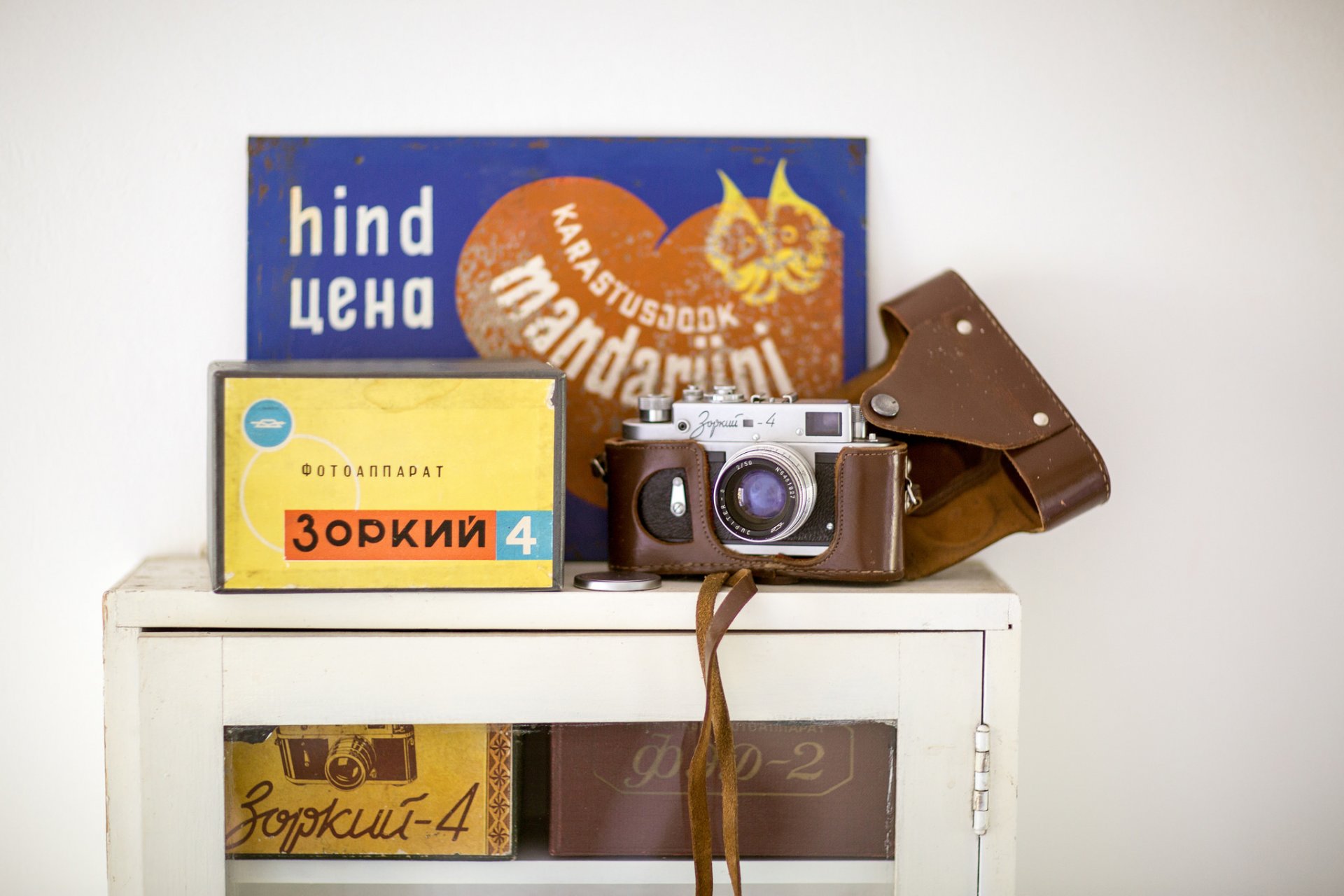 La leggendaria macchina fotografica sovietica e la scatola e-sotto di essaLa leggendaria macchina fotografica Sovietica e la scatola e-sotto di essa