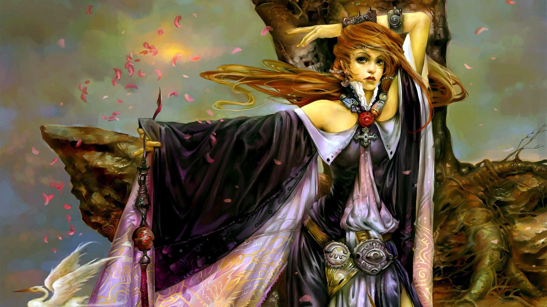 Ragazza con un bastone circondato da petali volantiRagazza con un bastone circondato da petali volanti