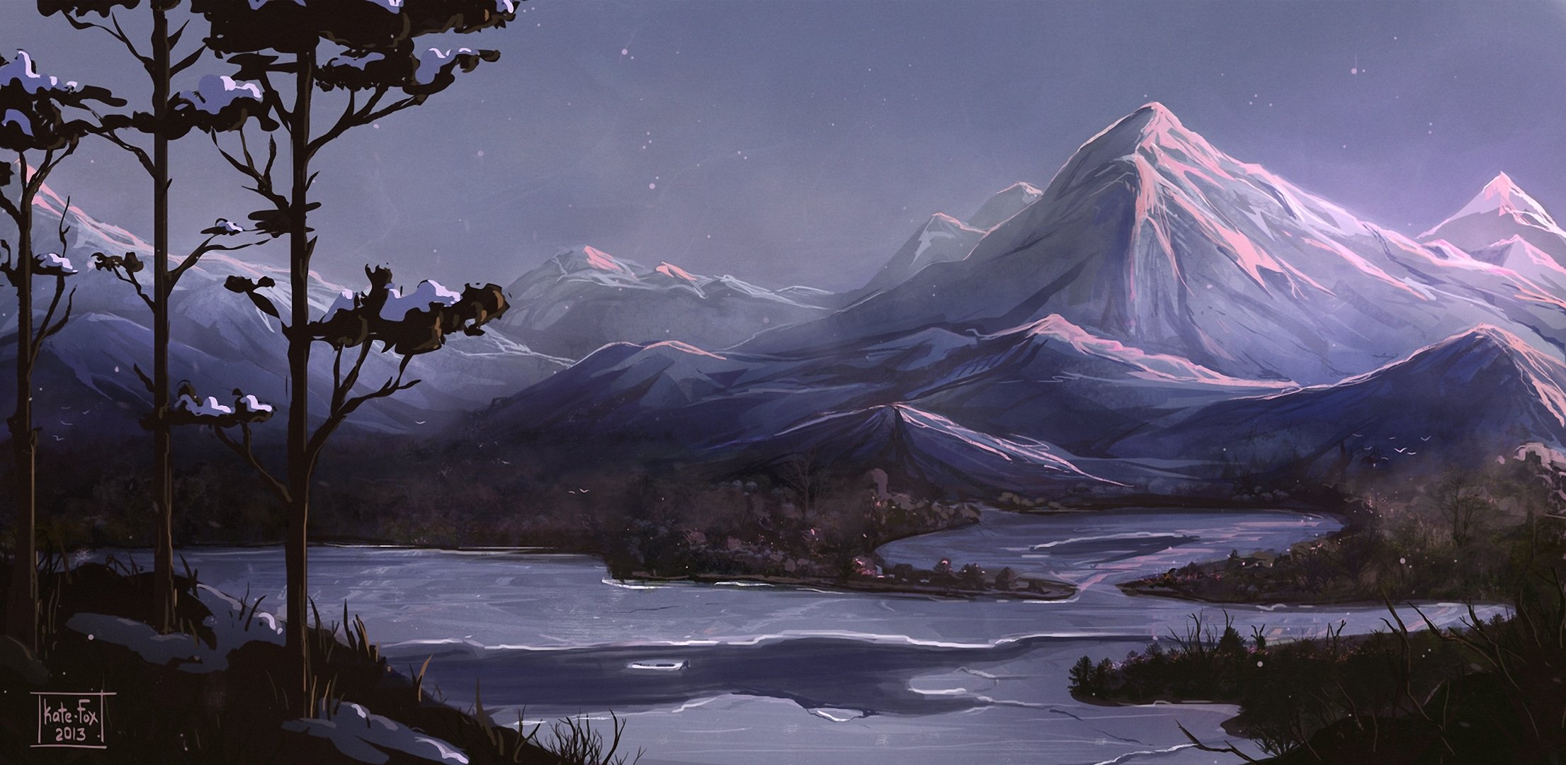 Paesaggio artistico del fiume notturno in montagnaPaesaggio artistico del fiume notturno in montagna
