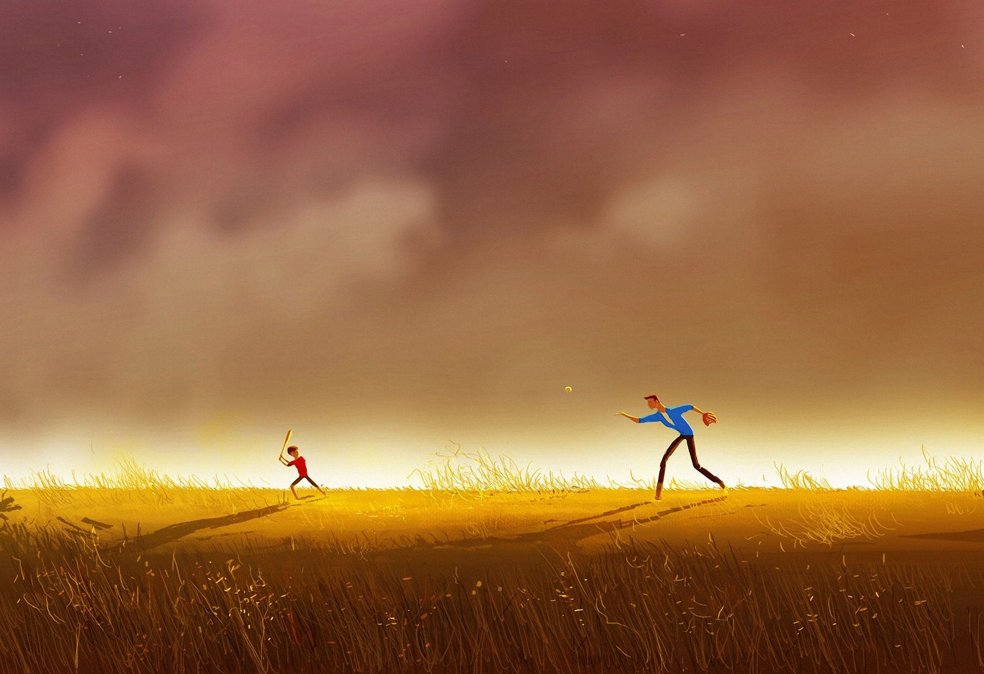 Padre e figlio dei cartoni animati che giocano a baseball sul campo d'autunno