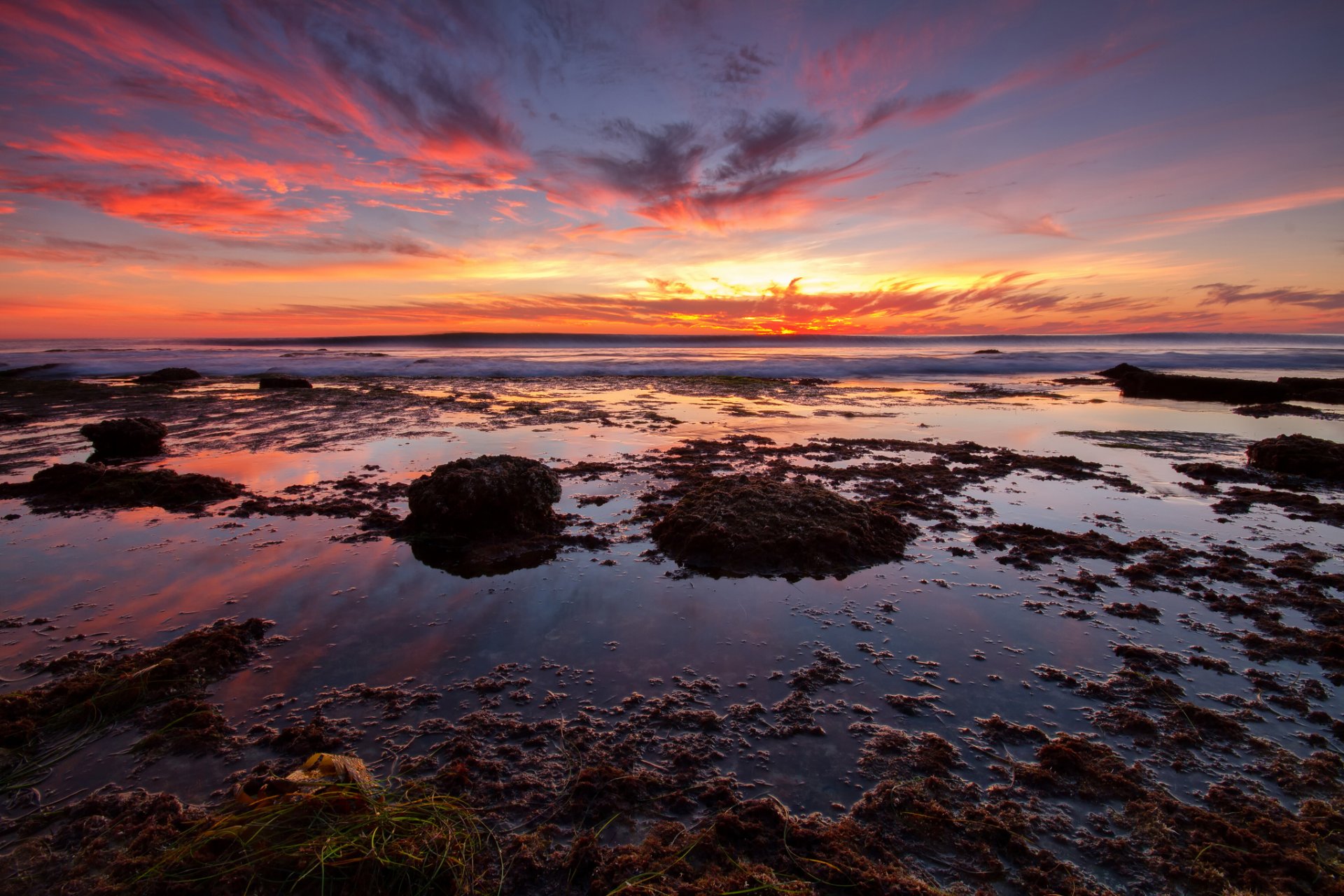 Rocce verdi in piedi nel mare trasparente sullo sfondo del tramonto