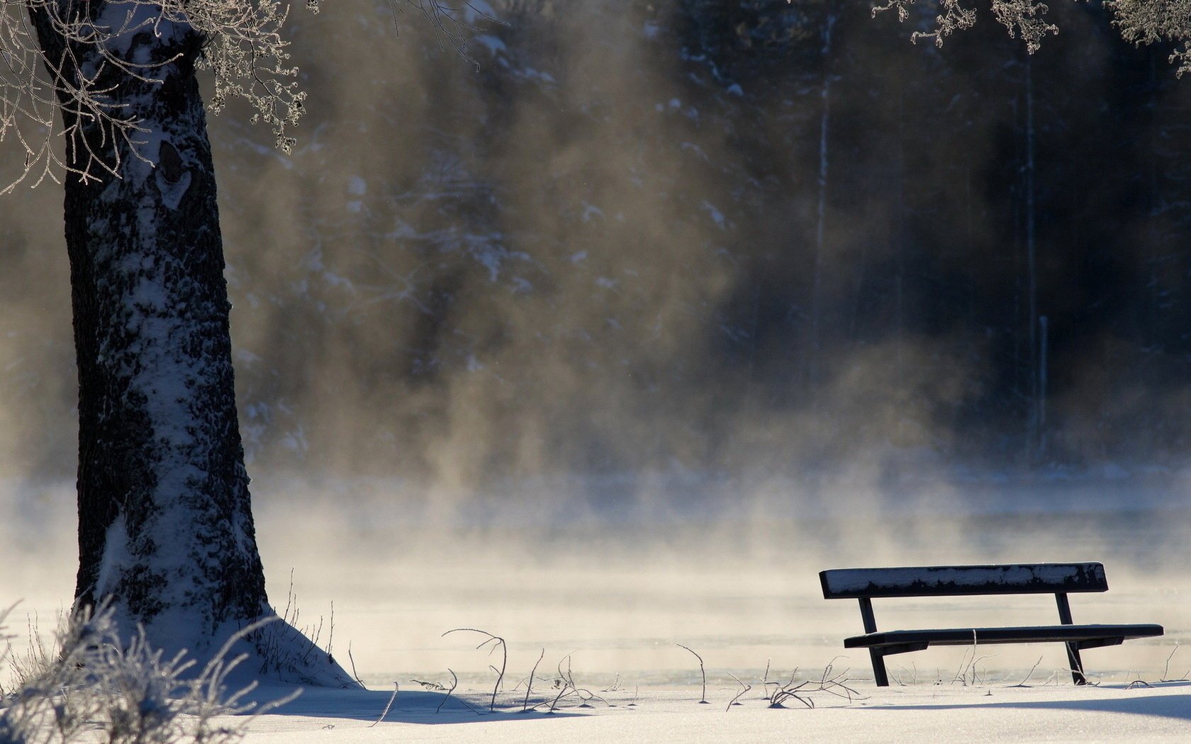 Panchina solitaria sullo sfondo della foresta invernale, nebbia