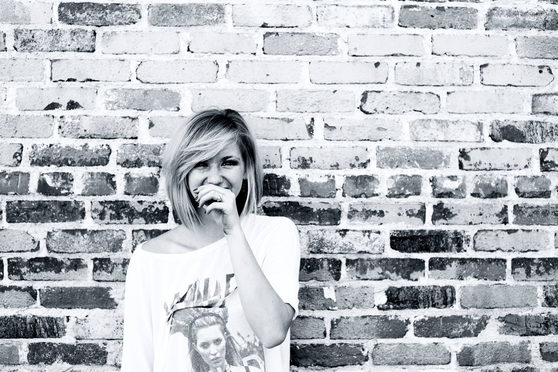 Ragazza che ride sullo sfondo di un muro di mattoniRagazza che ride sullo sfondo di un muro di mattoni