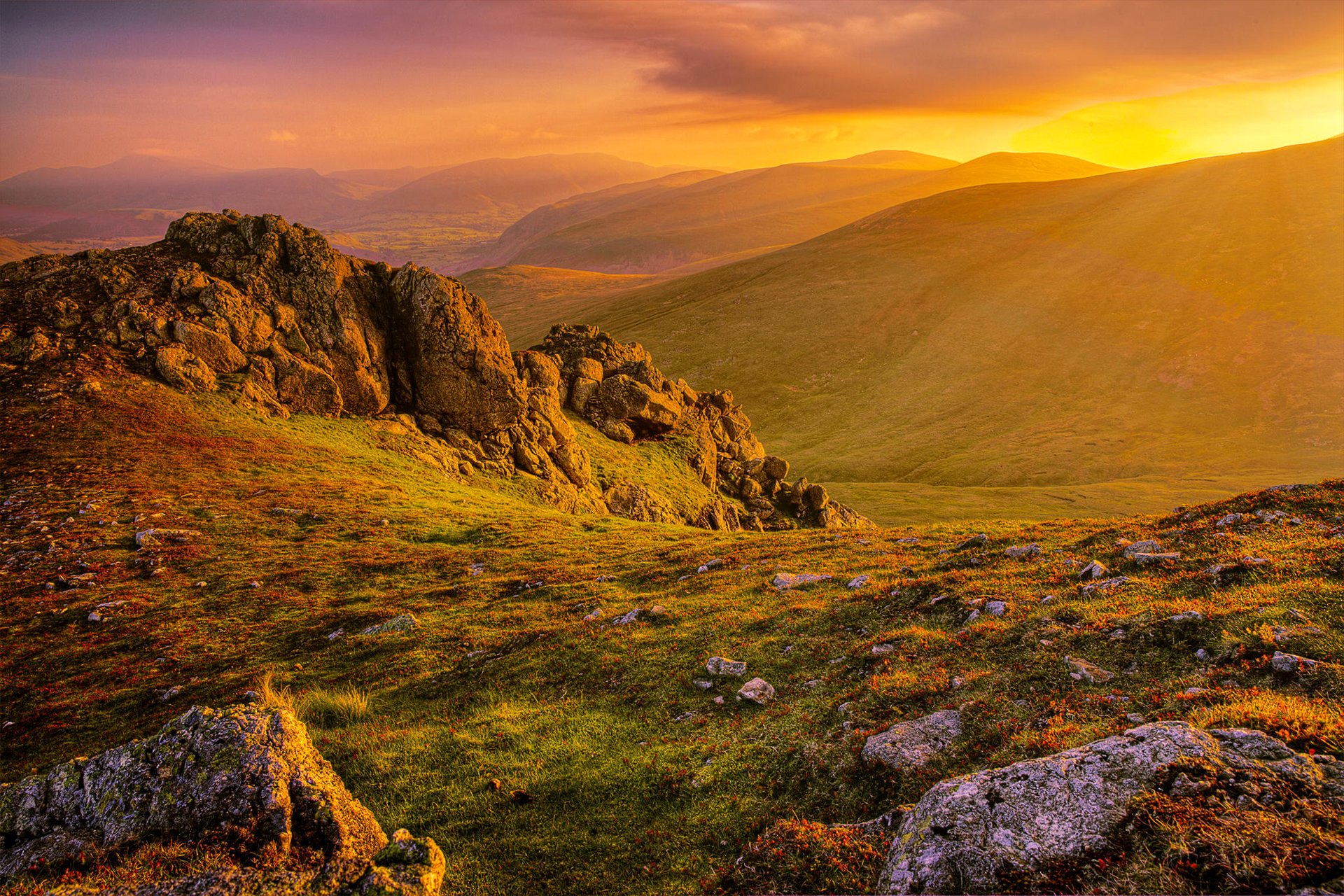 Rocce e colline di montagna illuminate dai raggi del sole in partenzaRocce e colline di montagna illuminate dai raggi del sole in partenza