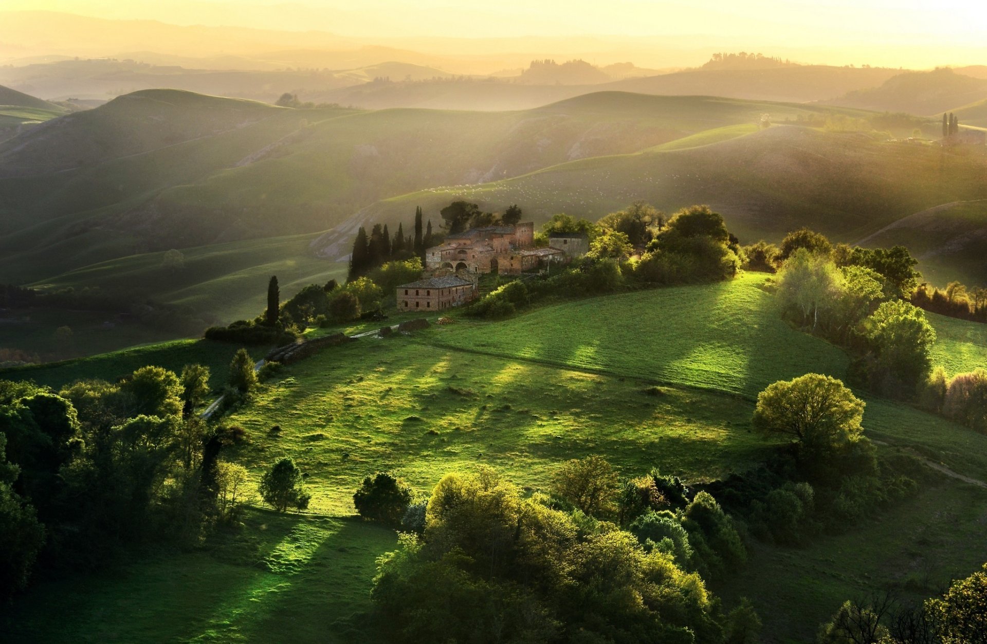 Strada sterrata attraverso un campo con erba gialla, orchi all'orizzonte, cielo con nuvole