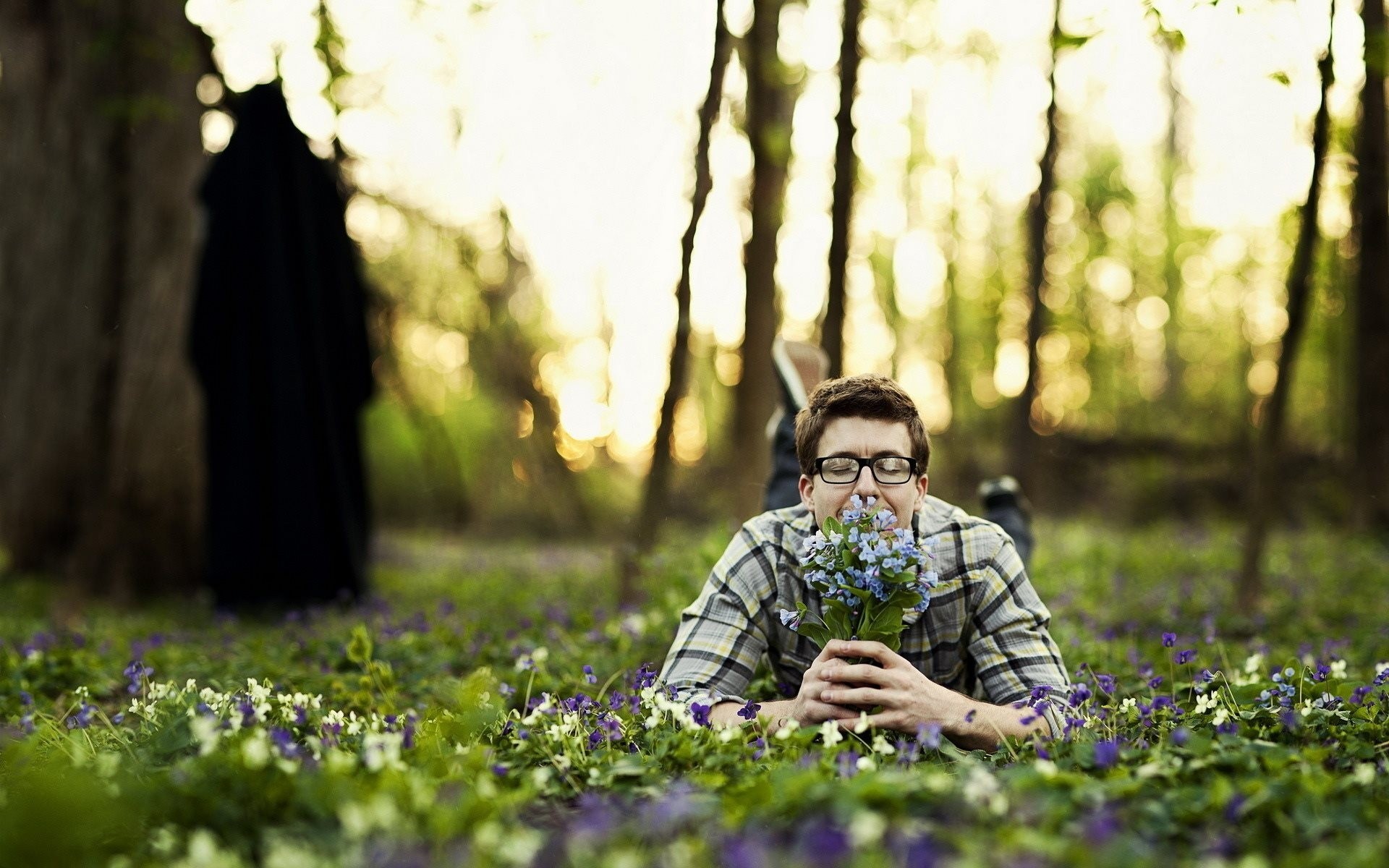 Uomo sdraiato su una radura nella foresta con un mazzo di fioriUomo sdraiato su una radura nella foresta con un mazzo di fiori
