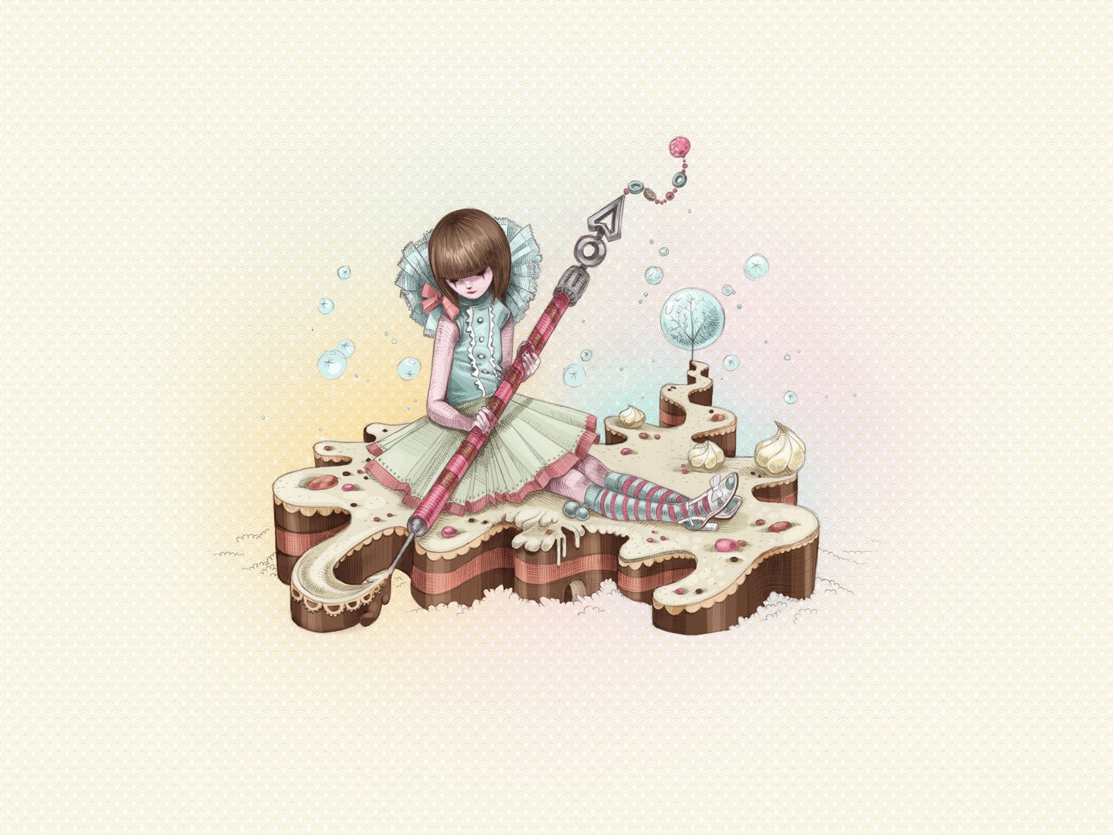 Su uno sfondo beige, una ragazza si siede su una torta