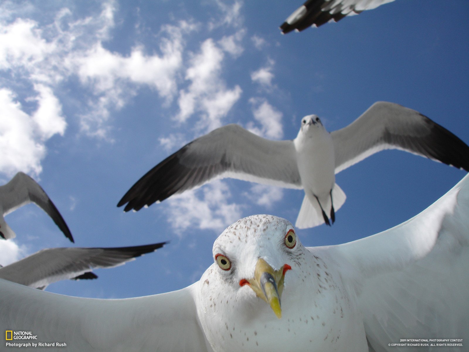 Uno stormo di cicogne che agita un'ala vola in uno stagno
