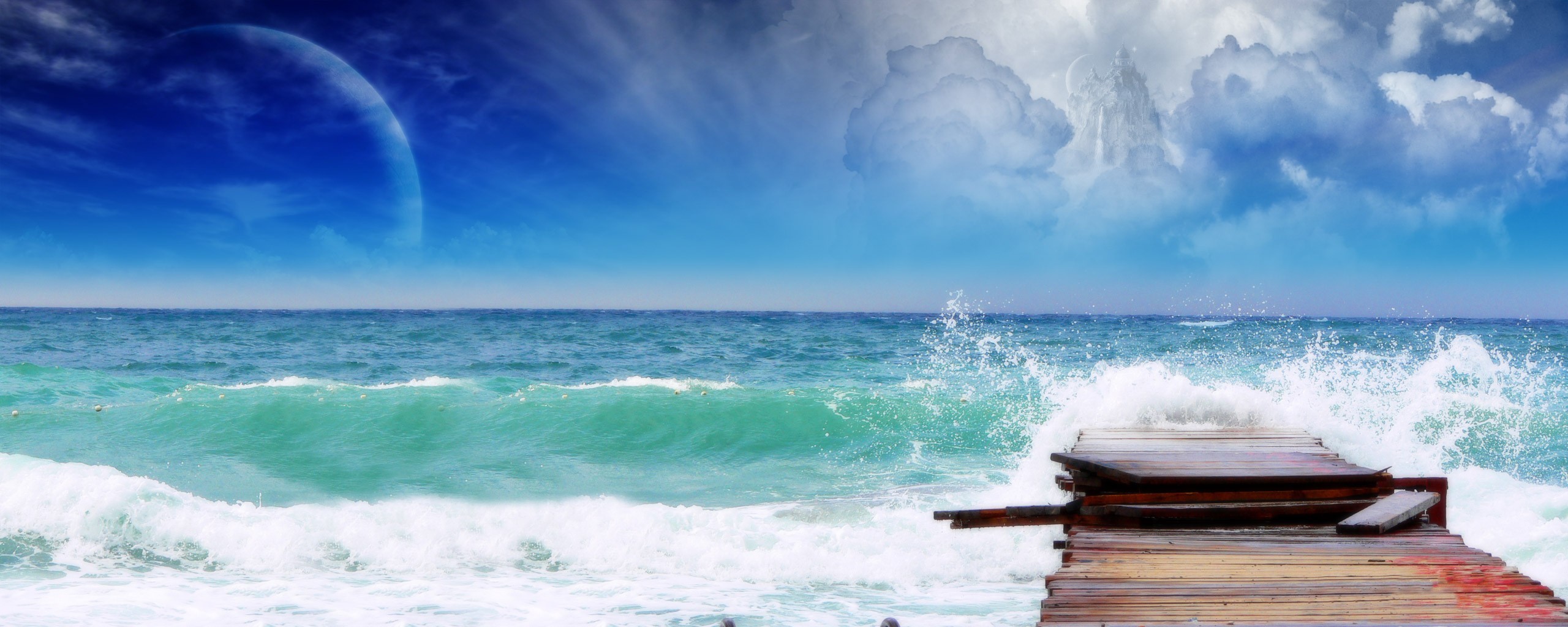 Le onde verdi del mare si infrangono su un molo sotto un cielo blu, in cui è visibile un castello d'aria dalle nuvoleLe onde verdi del mare si infrangono su un molo sotto un cielo blu, in cui è visibile un castello d'aria dalle nuvole