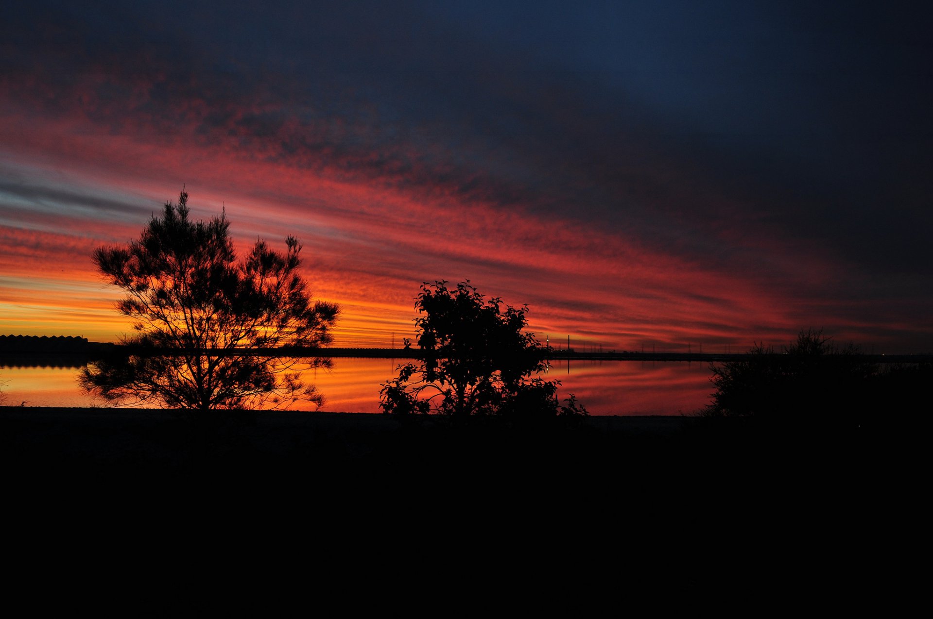 Paesaggio autunnale sul lago con tramonto sul cieloPaesaggio autunnale sul lago con tramonto sul cielo