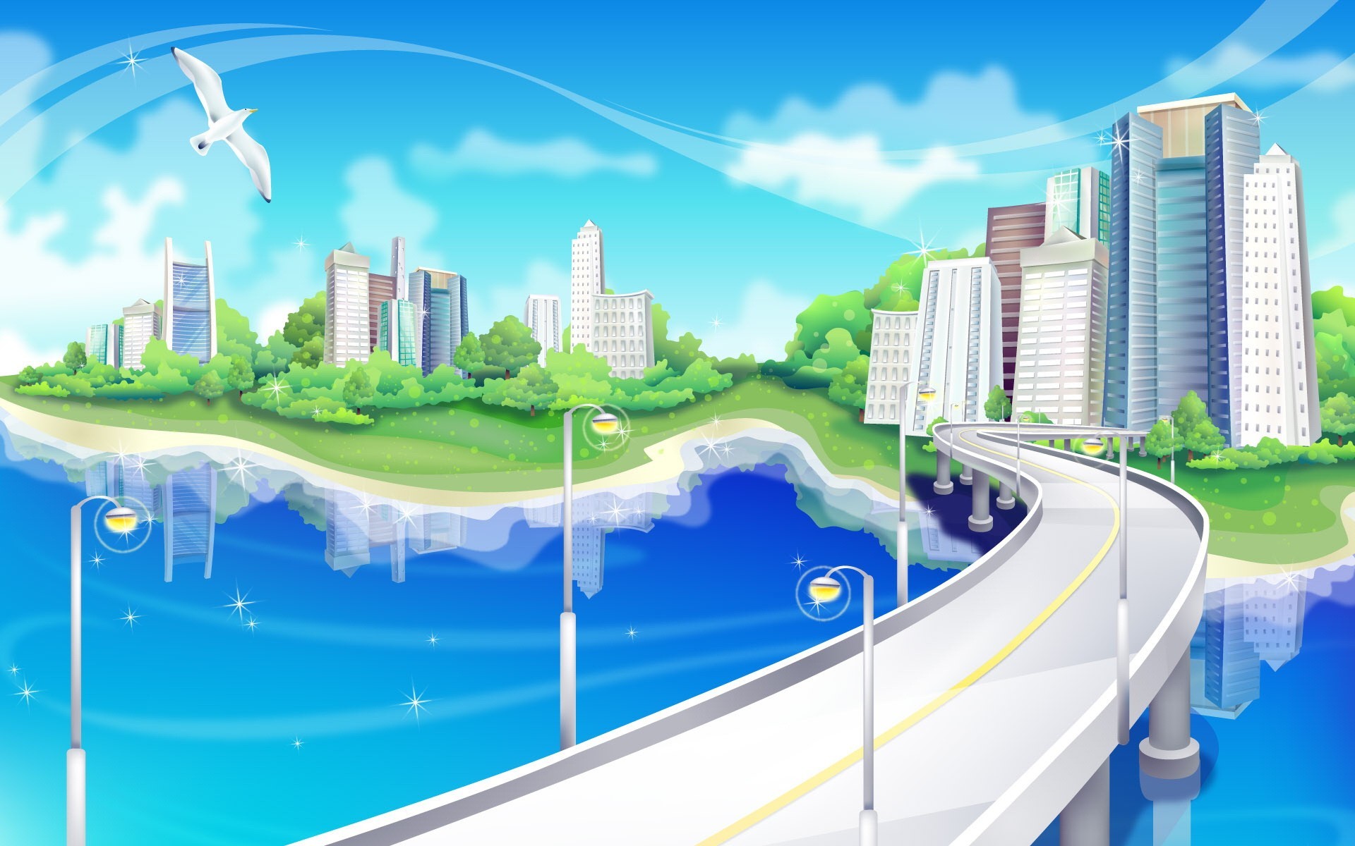 Bellissimo disegno del ponte e gabbiano nel cielo