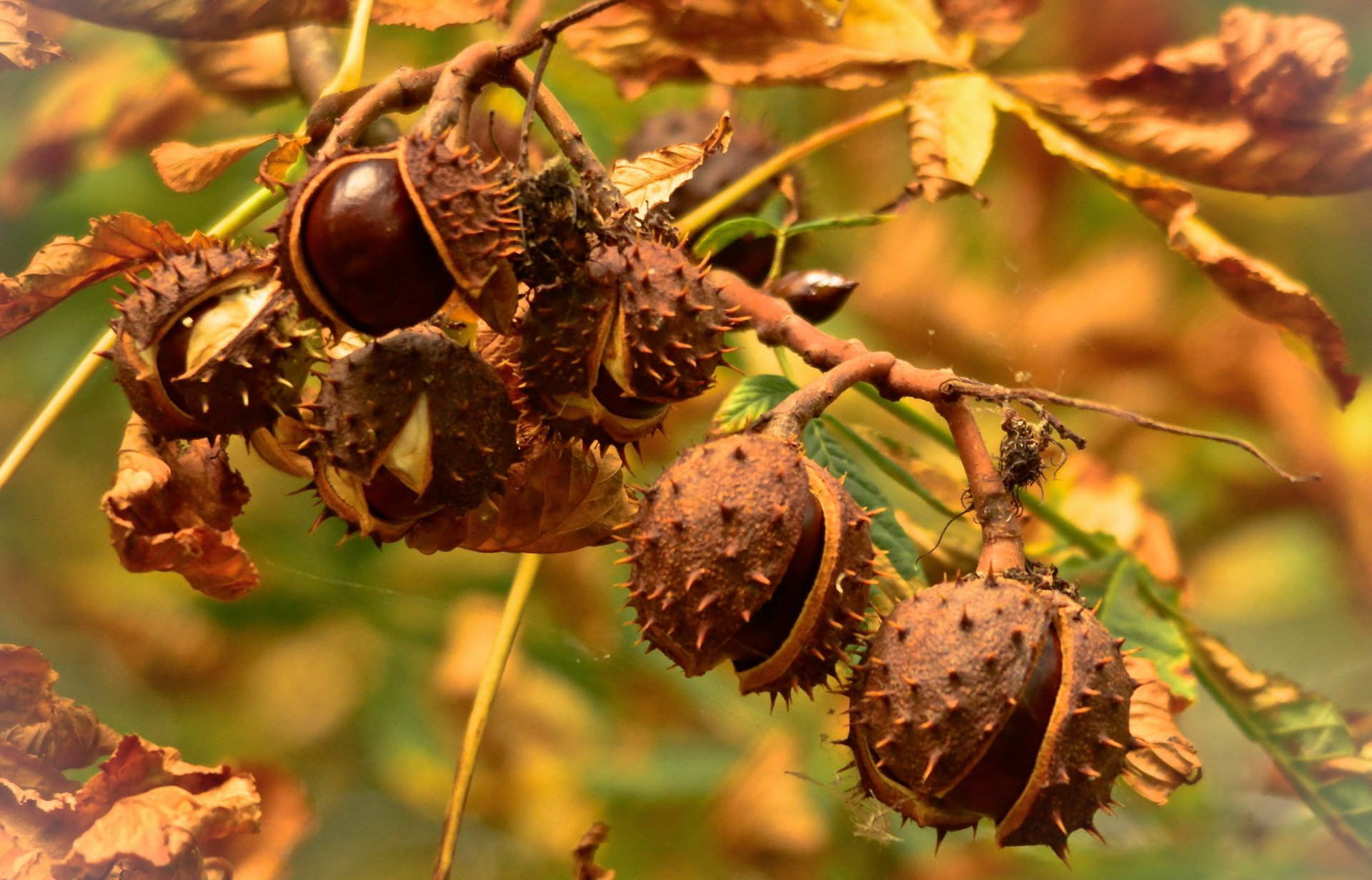 Fotografia macro di castagne autunnali troppo mature su un ramoFotografia macro di castagne autunnali troppo mature su un ramo
