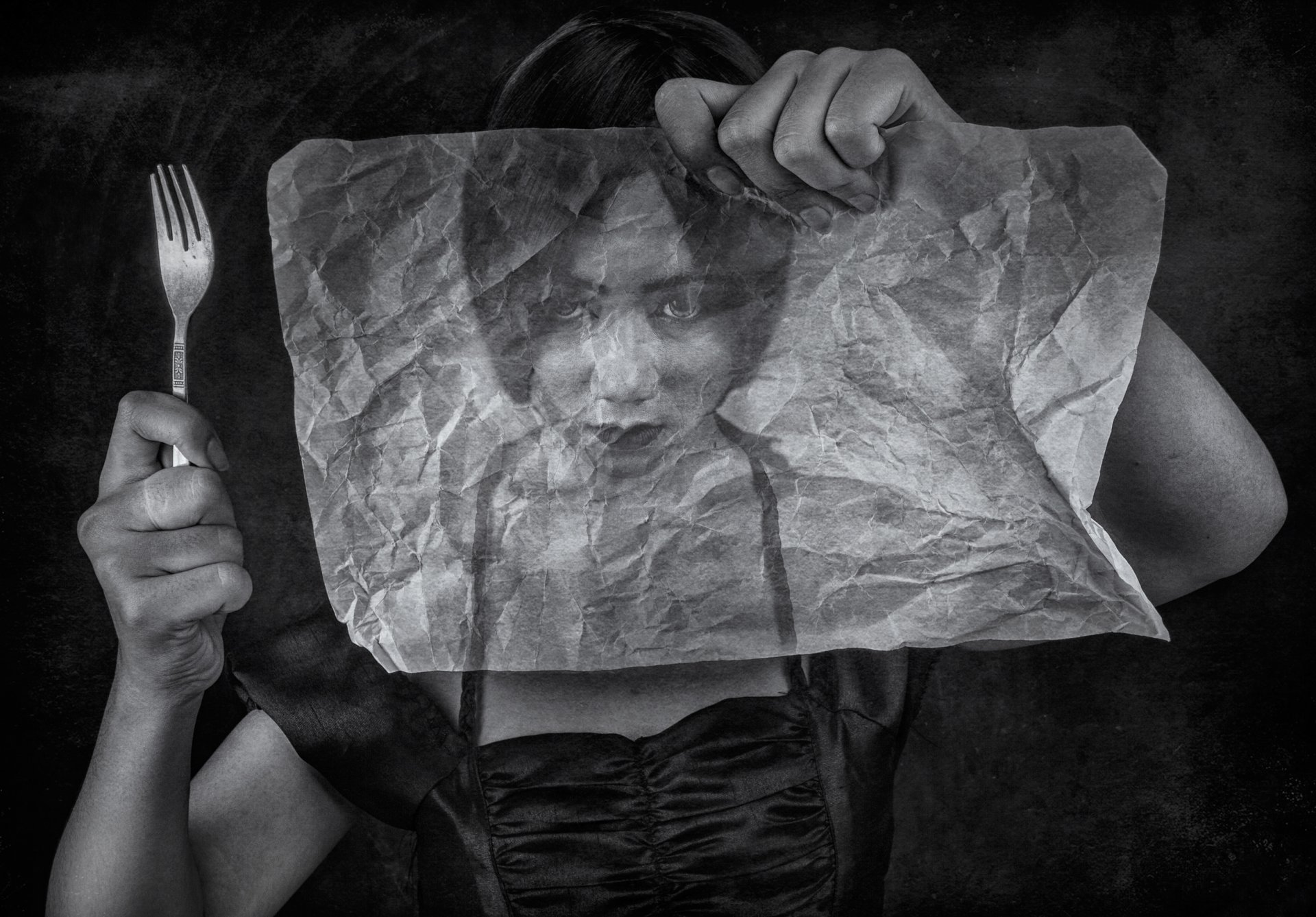 Immagine di una ragazza con una forchetta attraverso una carta da lucido accartocciataImmagine di una ragazza con una forchetta attraverso una carta da lucido accartocciata