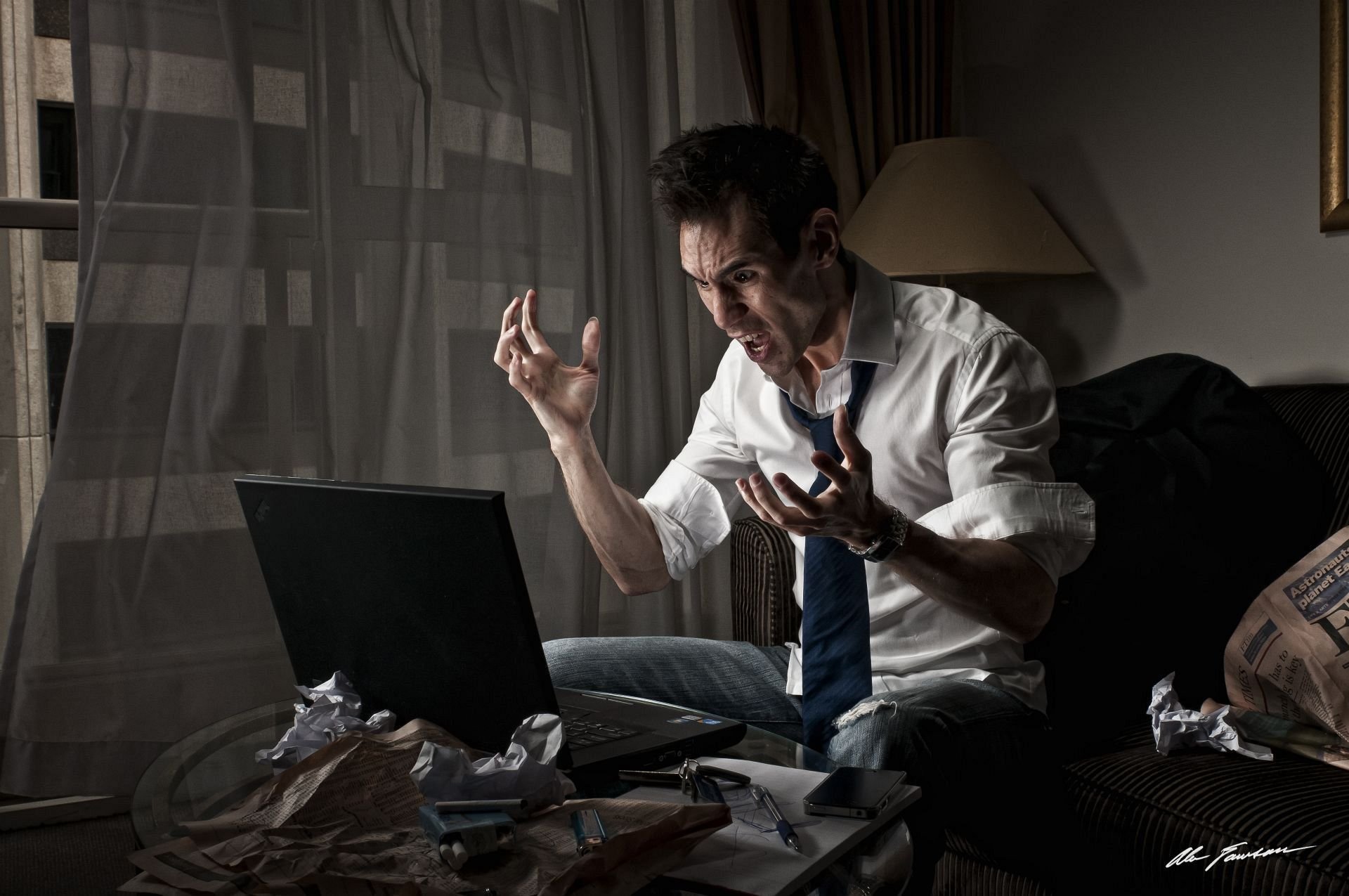 L'uomo è disperatamente arrabbiato per il laptop la sera